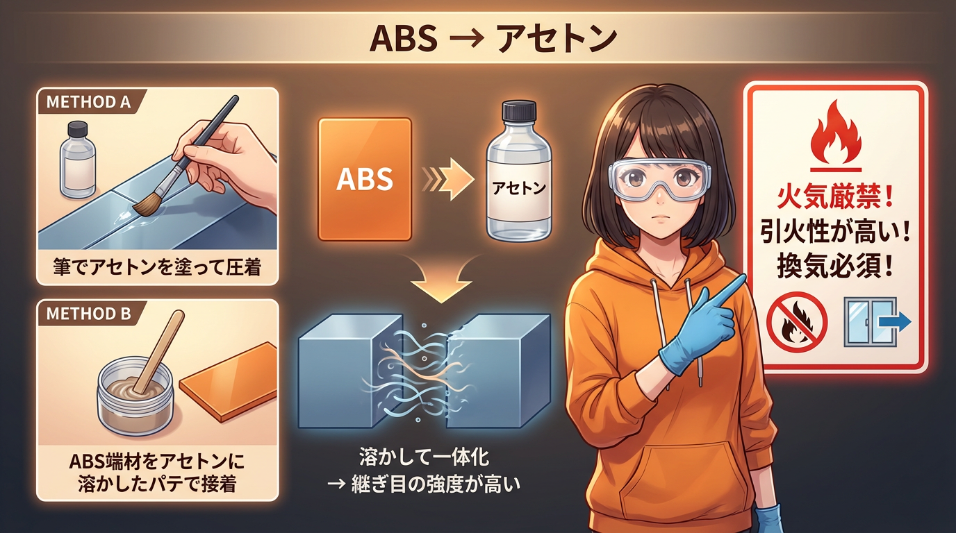 ABSにはアセトン(プラスチック自体を溶かしてくっつける)