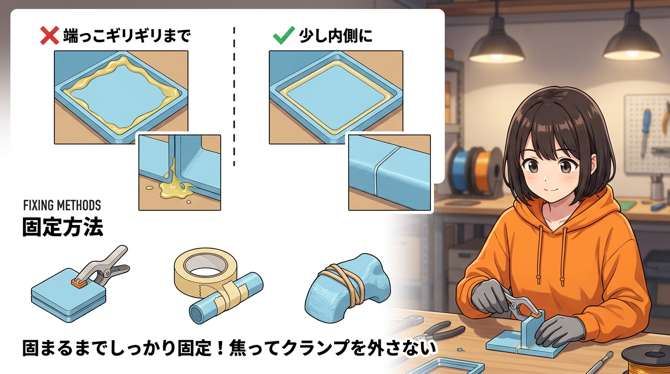 ただしデメリットが2つ。固まるまでに時間がかかる(完全に固まるには丸一日くらい)ことと、混ぜる前の液体が肌に触れるとかぶれることがあること。クランプやテープでしっかり固定して待つのと、使い捨て手袋をして作業するのがポイントです。