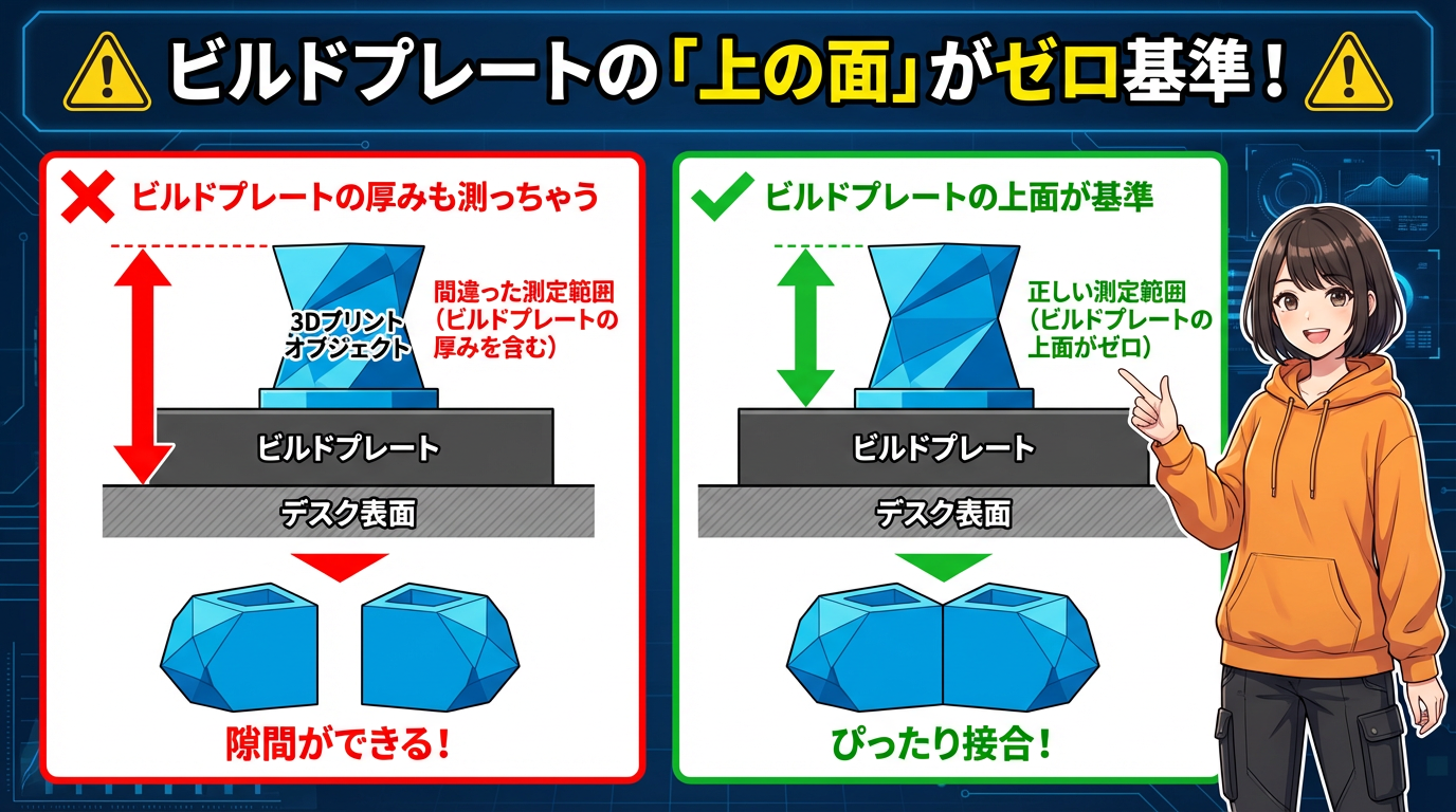 測定するときは、ビルドプレートの「上の面」をゼロ基準にしてください。造形物が直接くっついてる面です。