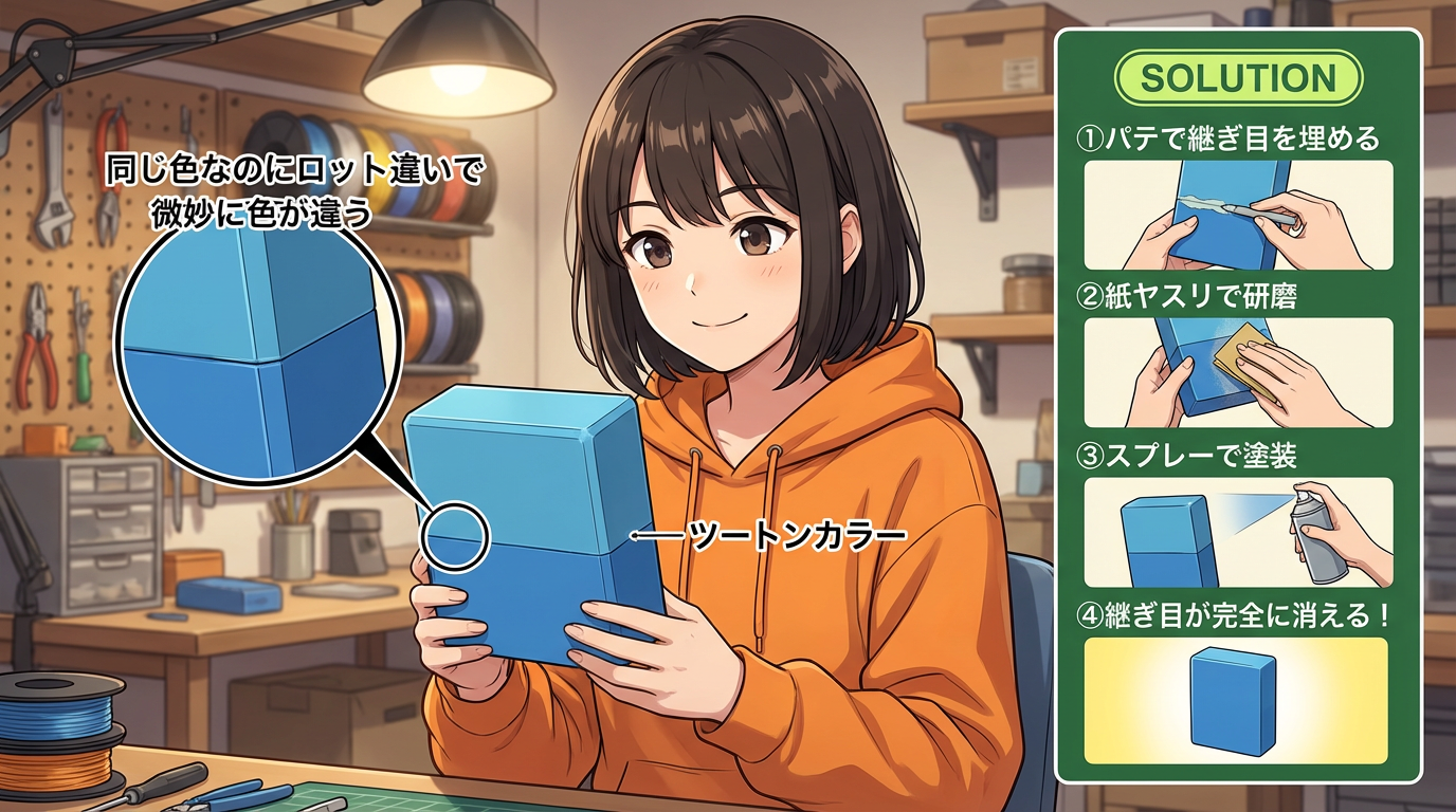 上半分を印刷するときに、同じ色のフィラメントを使ったはずなのに、くっつけてみたら色が微妙に違うっていうパターン。同じメーカーの同じ色でも、製造ロット(作られた時期)が違うと、色味がほんの少し変わることがあるんです。特にシルク系とかマット系のフィラメントで顕著。