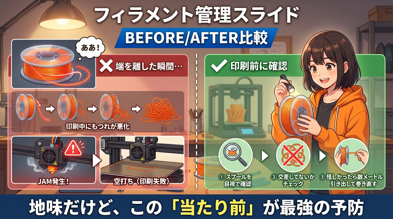 対策は簡単。印刷前にスプールをよく見て、フィラメントが交差してないか確認してください。ちょっとでも怪しかったら、数メートル引っ張り出して、きれいに巻き直す。地味なんですけど、この「当たり前のこと」をやるかやらないかで、失敗率が全然変わるんですよ。