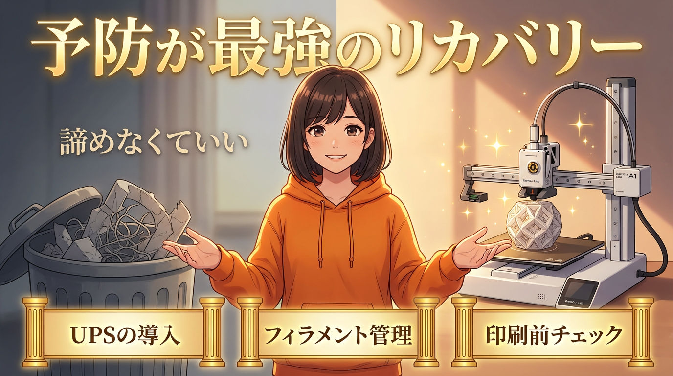 でも今日紹介した方法を知っていれば、大部分を救える可能性がある。そして同時に、「そもそも止まらないようにする予防」も大事。UPSの導入、フィラメントの管理、印刷前のチェック。