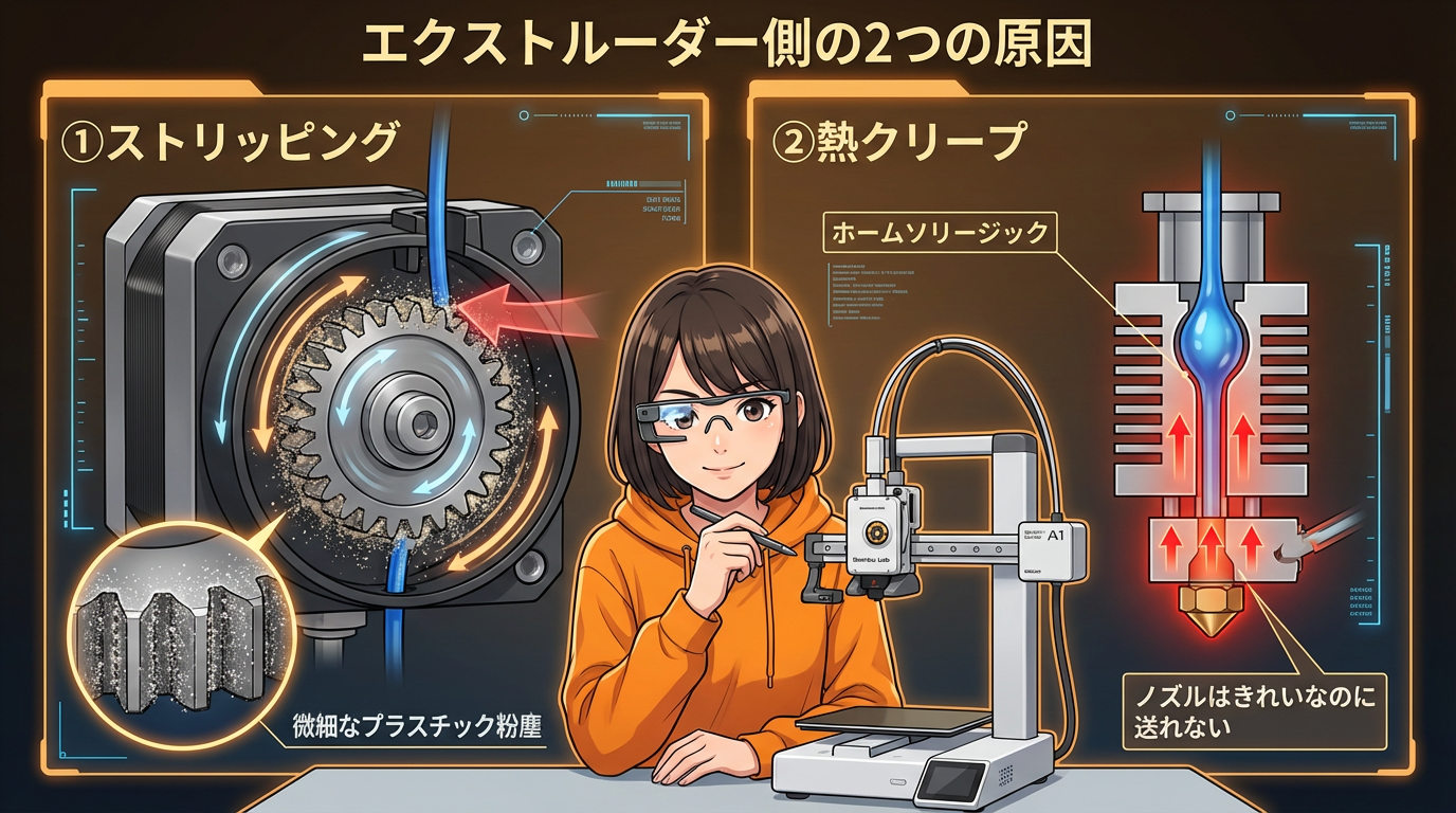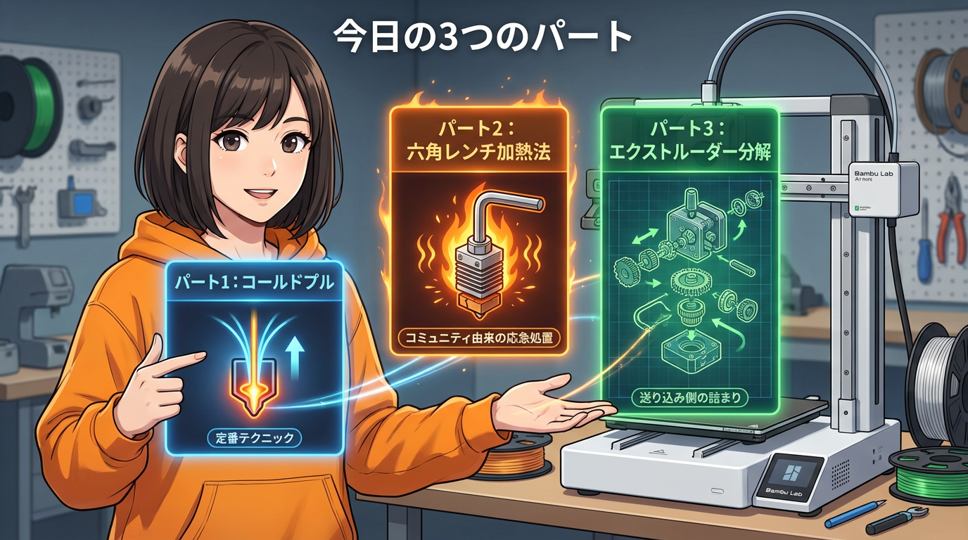 定番のメンテナンス技術「コールドプル」を中心に、六角レンチ加熱法、エクストルーダー分解まで一気にいきます。