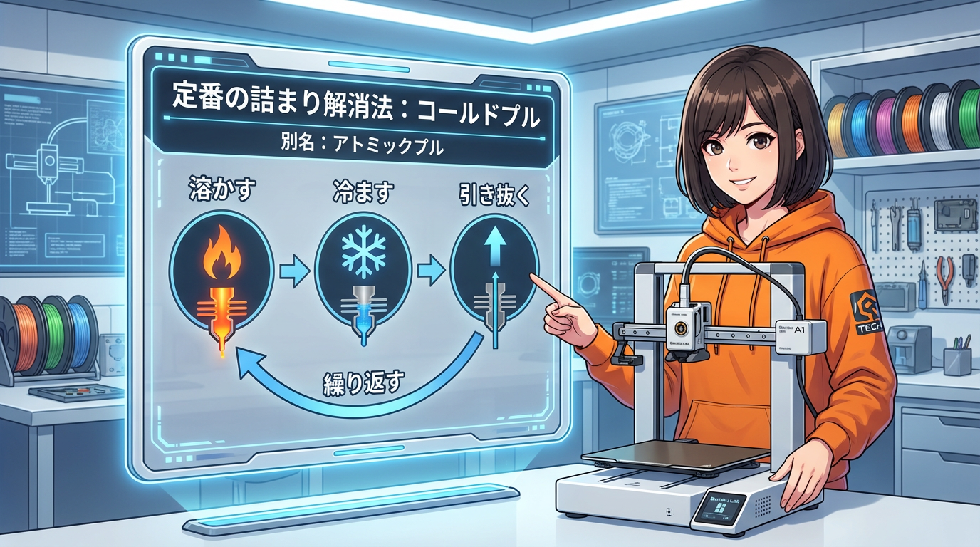 コールドプル、別名「アトミックプル」。温度パージでも清掃ピンでもダメだった場合に、まず試したい定番中の定番です。