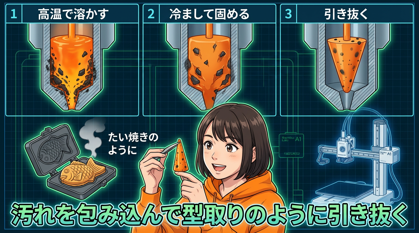 高温で溶かした樹脂がノズル内部の隅々まで行き渡って、壁にこびりついた汚れの隙間にも入り込みます。そこから温度を下げると、汚れを包み込みながら固まっていく。完全に固まる「直前」に引き抜くと、ノズル内部の型取りのように汚れごと全部出てくる仕組みです。