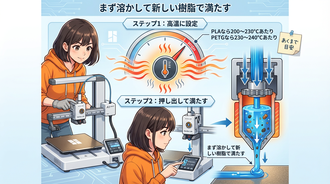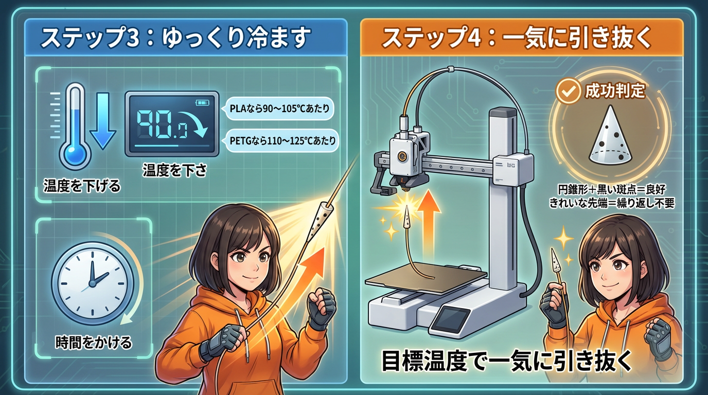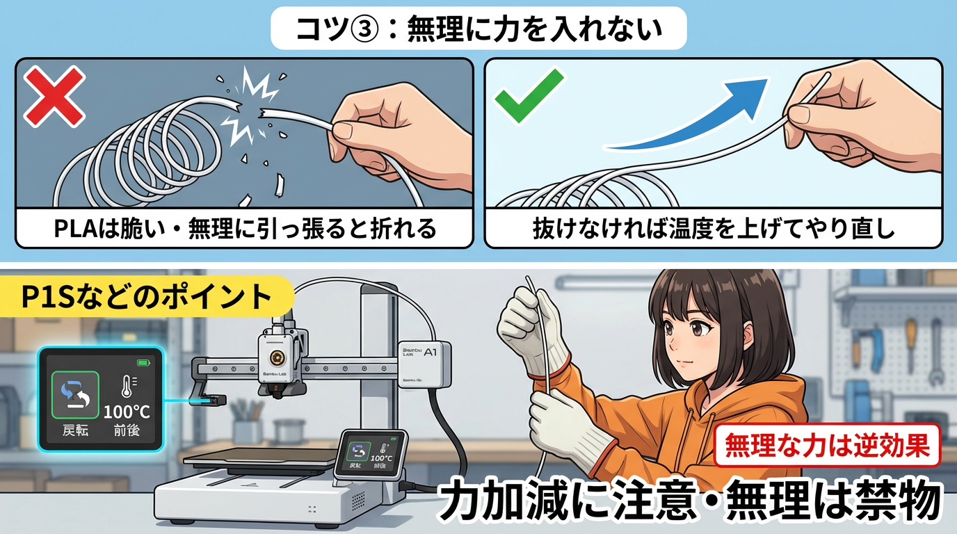 P1Sなどでは、100℃前後まで下がったタイミングで、画面の引き戻し操作を使いながら、フィラメント端を軽く補助して引き抜く方法が知られています。固すぎる場合はいったん温度を見直してください。