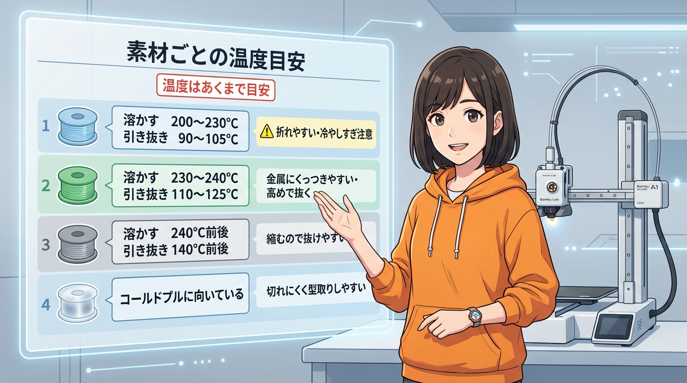 コールドプルで一番大事なのは温度管理。素材ごとの目安を紹介します。温度はあくまで目安で、機種やノズル径、残っている素材によって最適値は前後します。