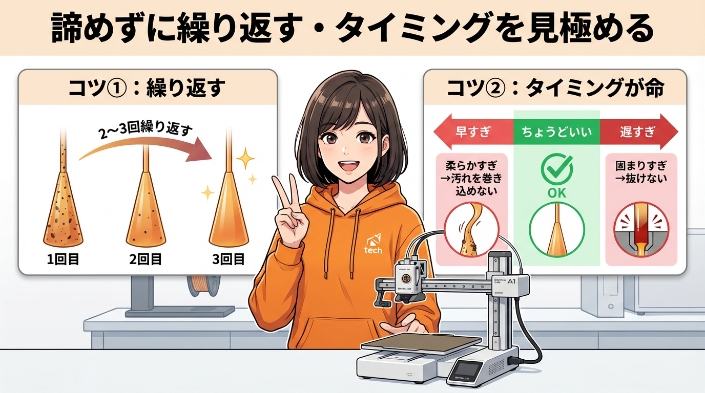 特に効果的なのが、フィラメントの種類を変えるとき。PLAからPETG、PETGからTPUなど、素材変更後に押し出しが不安定になりやすい人は、前の素材を使って予防的にコールドプルを1〜2回試してみる価値があります。
