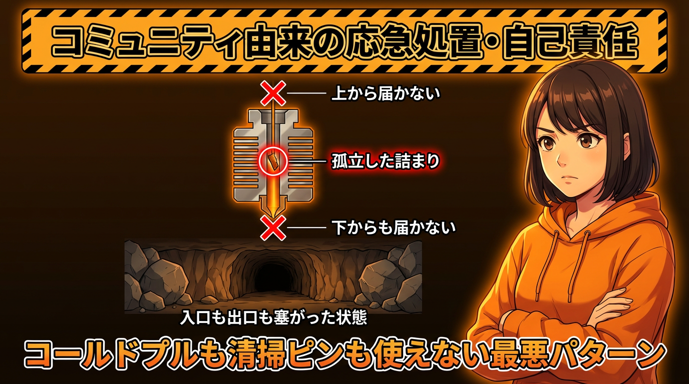 ここからは、公式の基本手順というより、ユーザーコミュニティで共有されている応急処置の紹介です。機種や詰まり位置によっては有効ですが、自己責任の要素が強いため、まずは公式のコールドプルや分解清掃を優先してください。
