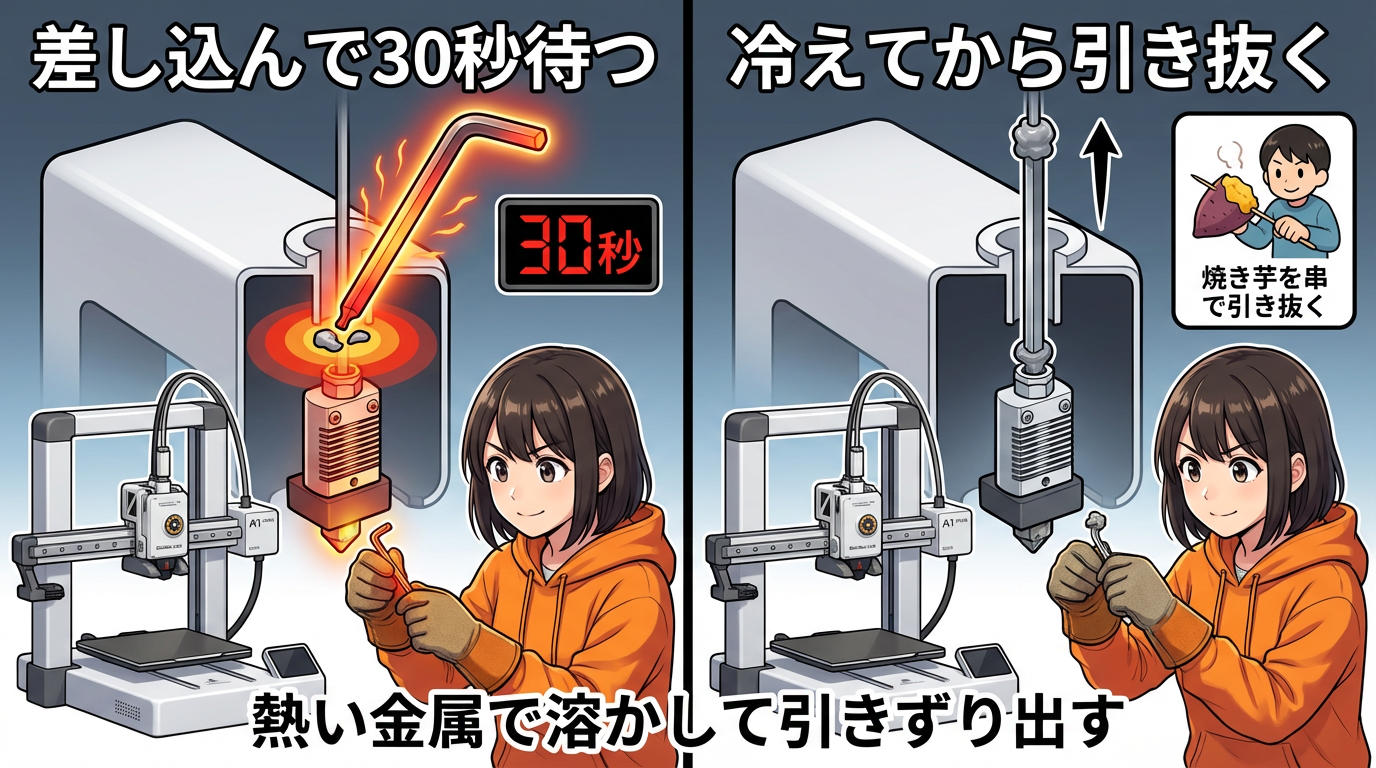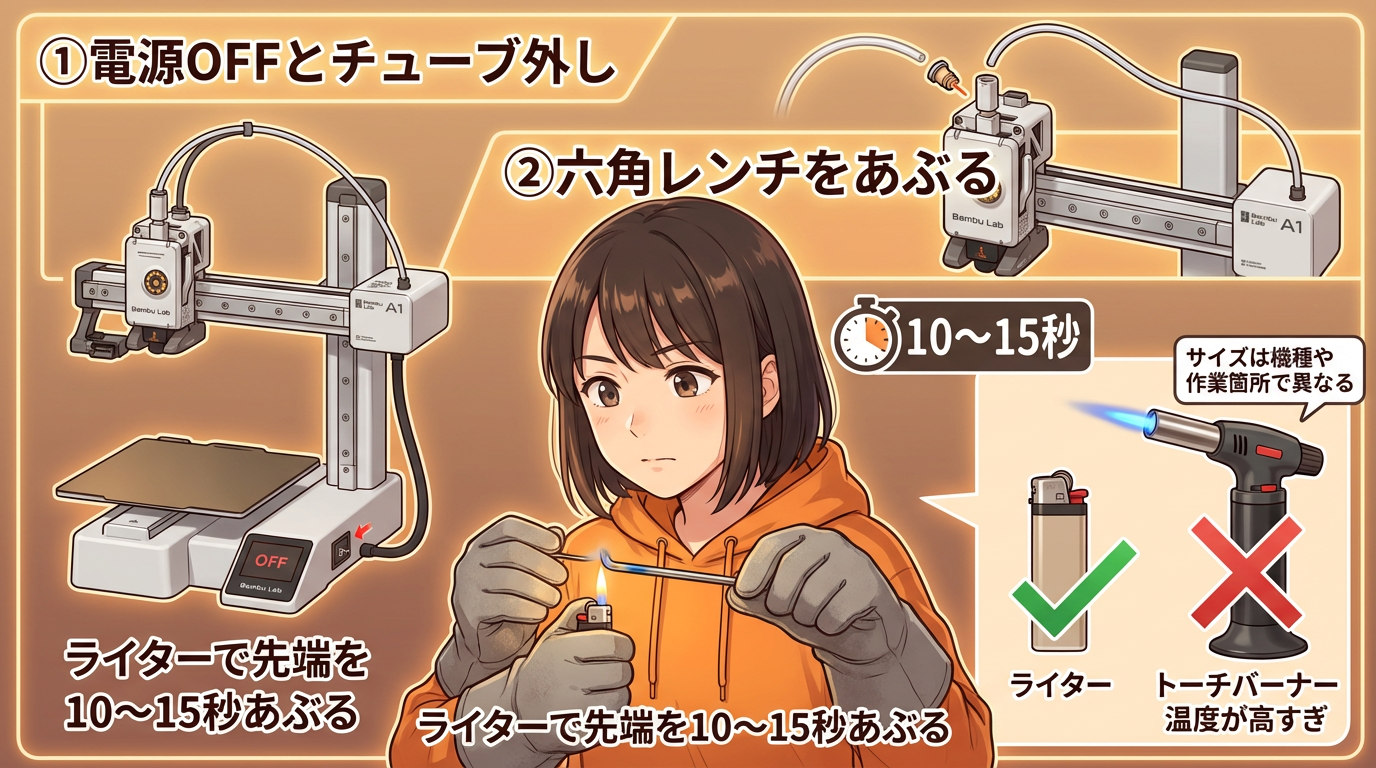 ② 六角レンチ加熱法 ─ 孤立した詰まりの応急処置 🔩