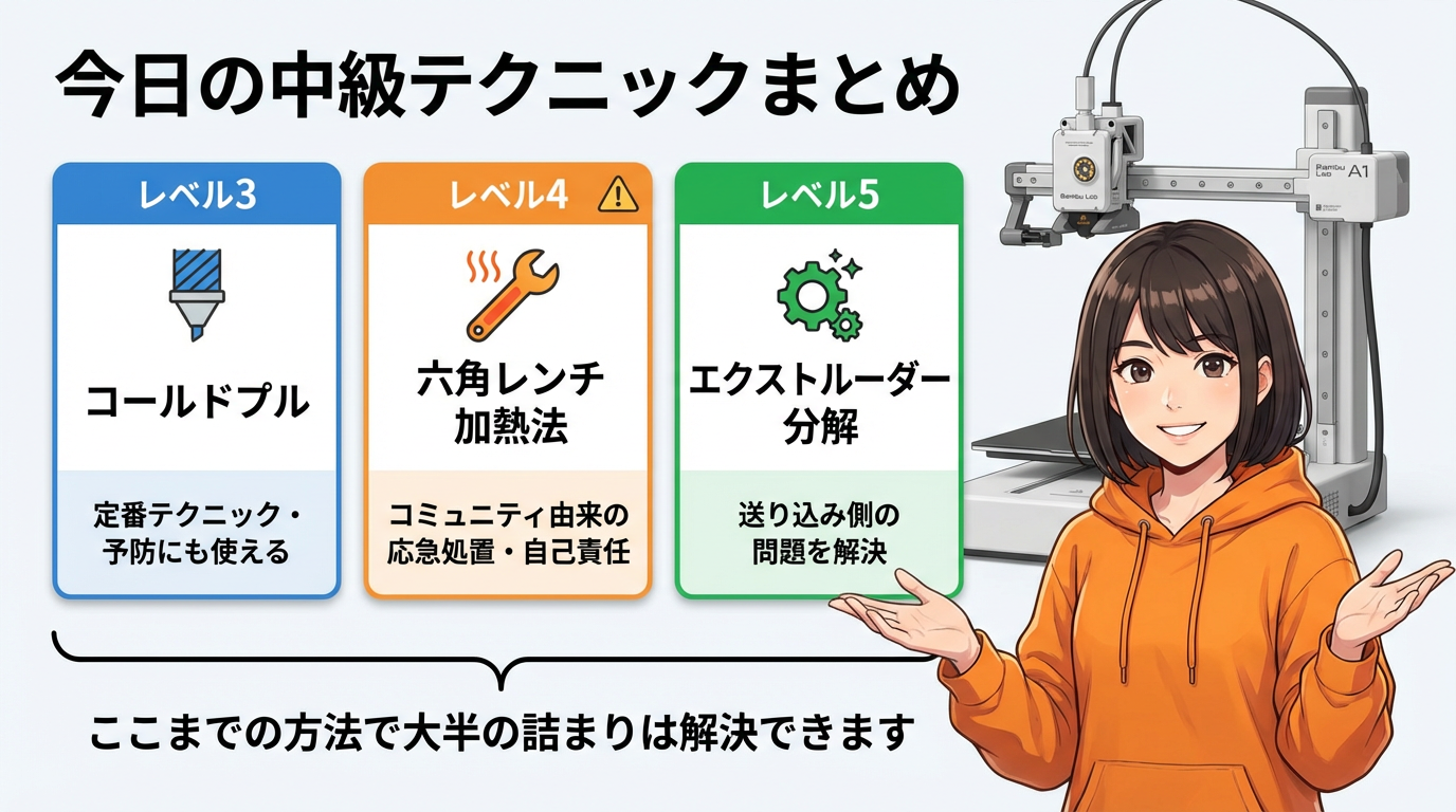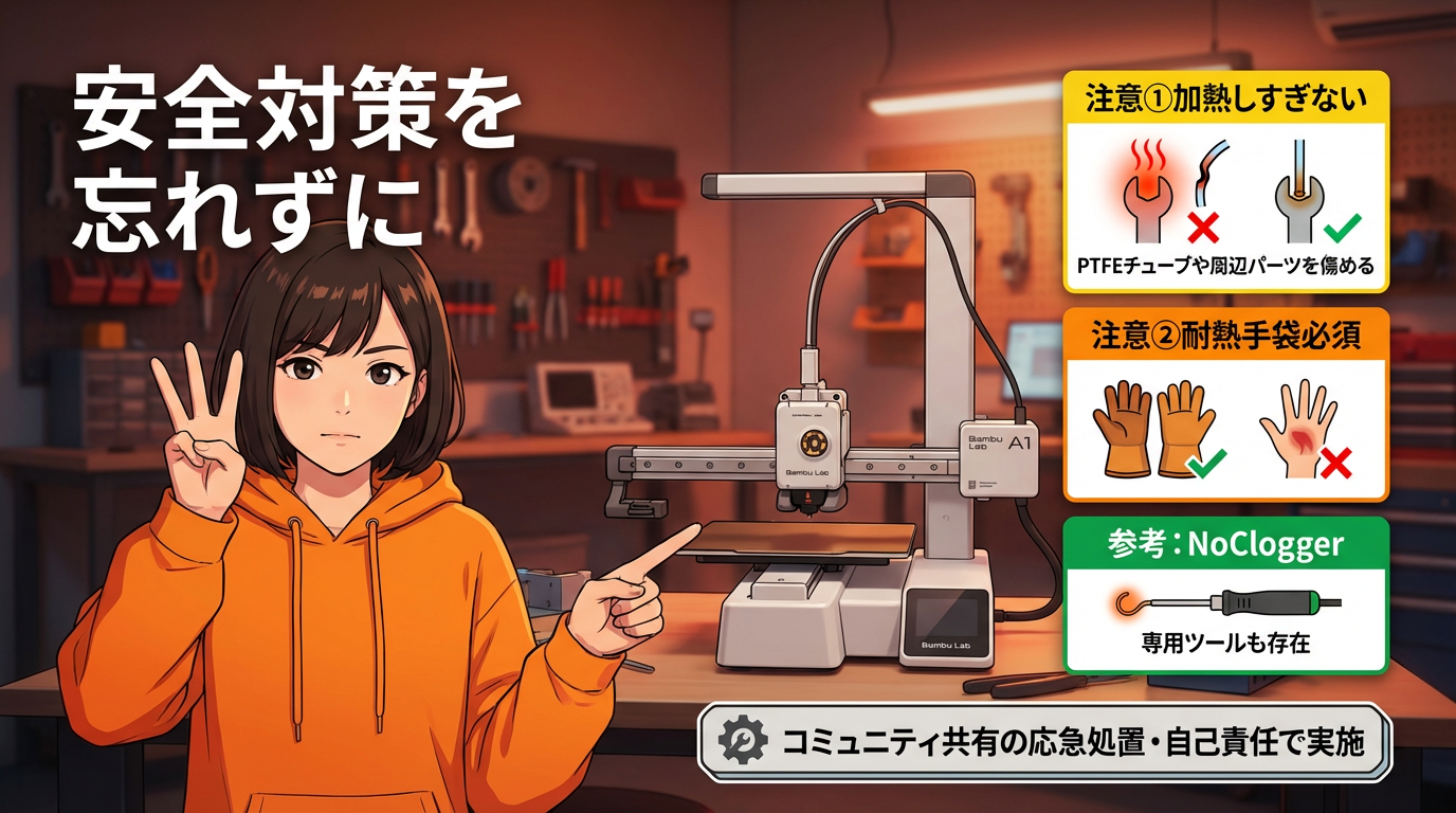 「レベル4:六角レンチ加熱法」─ フィラメントが折れて孤立した詰まりに対応。コミュニティ由来の応急処置で、自己責任の要素が強い上級者向けテクニック。