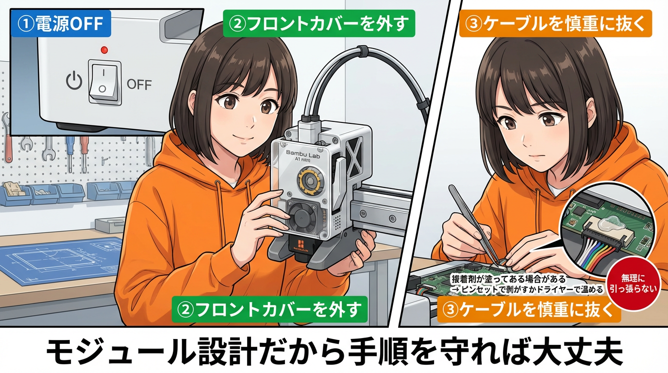 Bambu Labのプリンターはモジュール設計なので、手順を守れば大丈夫。
