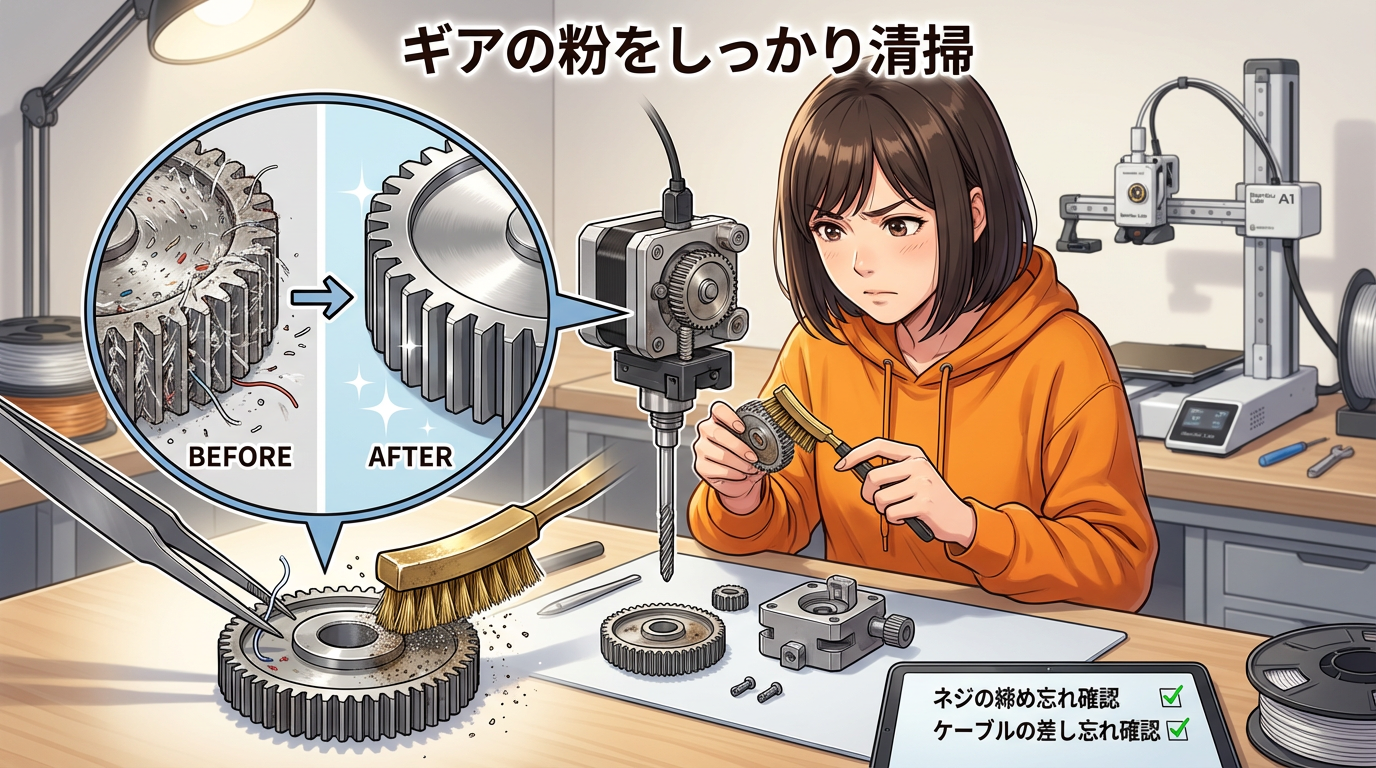 「レベル5:エクストルーダー分解」─ ギアの清掃でフィラメント送り込み側の問題を解決。
