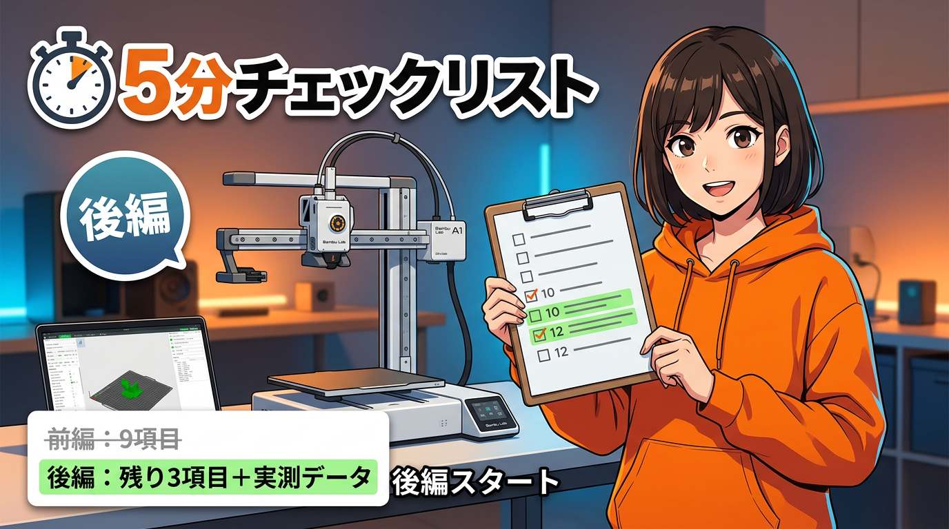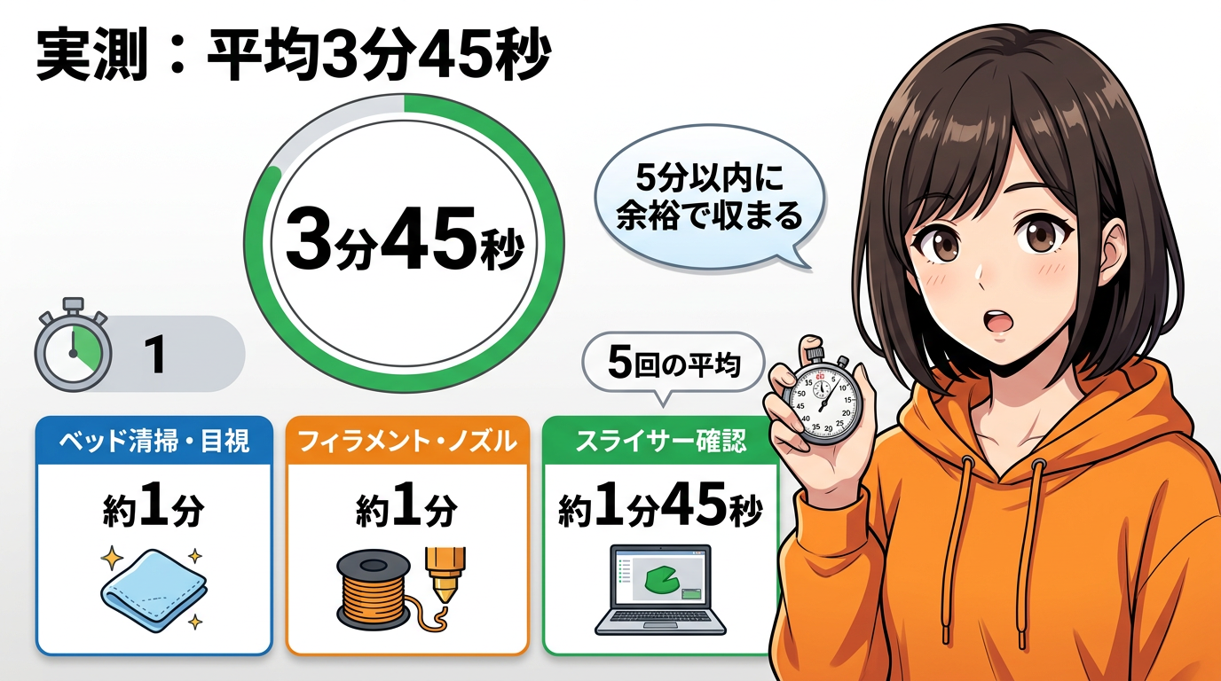 内訳は、ベッド清掃と目視確認に約1分。フィラメントとノズル周辺の物理的チェックに約1分。スライサー画面での設定・プレビュー確認に約1分45秒。タイトルの「5分」にも十分に収まります。