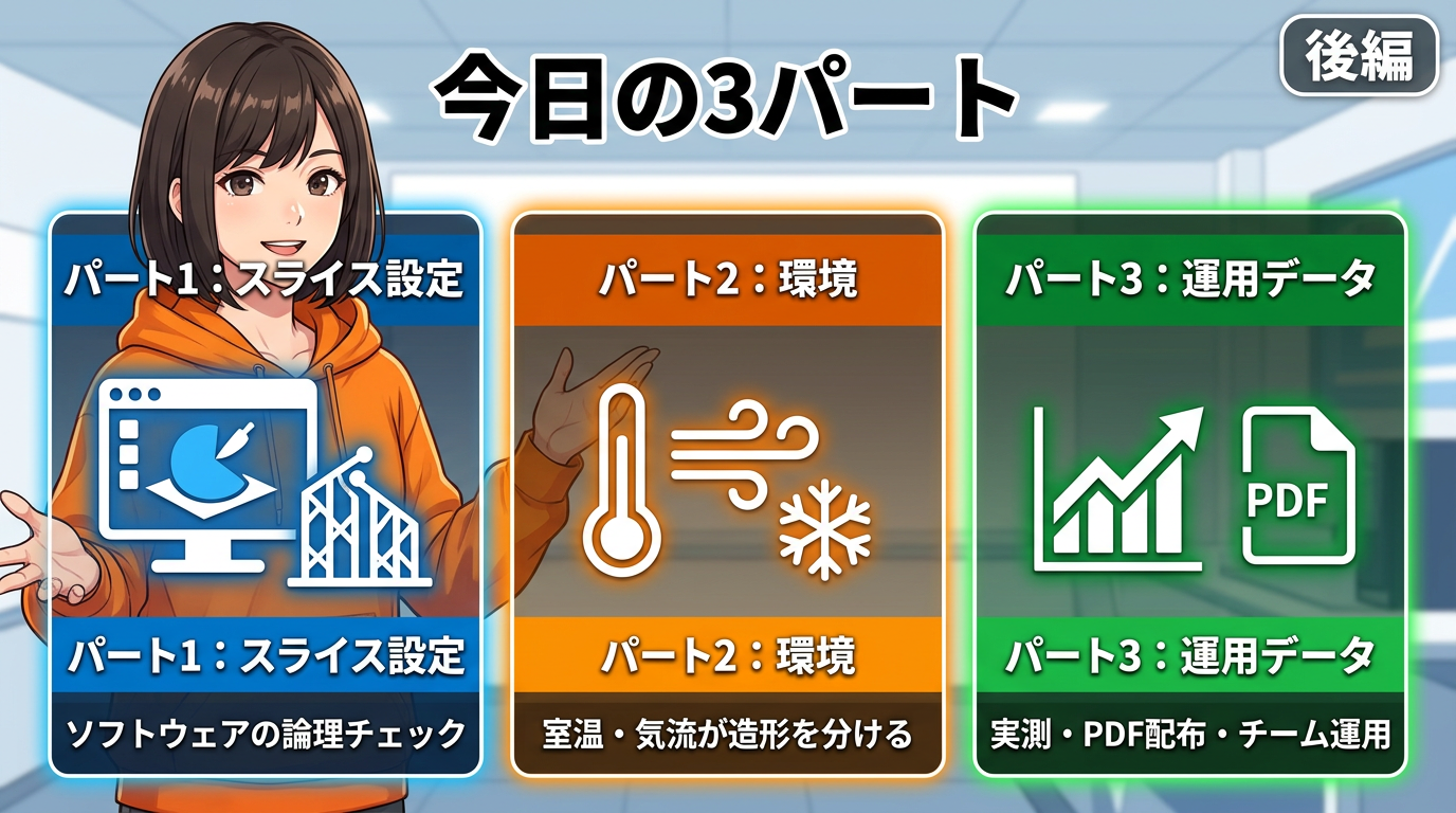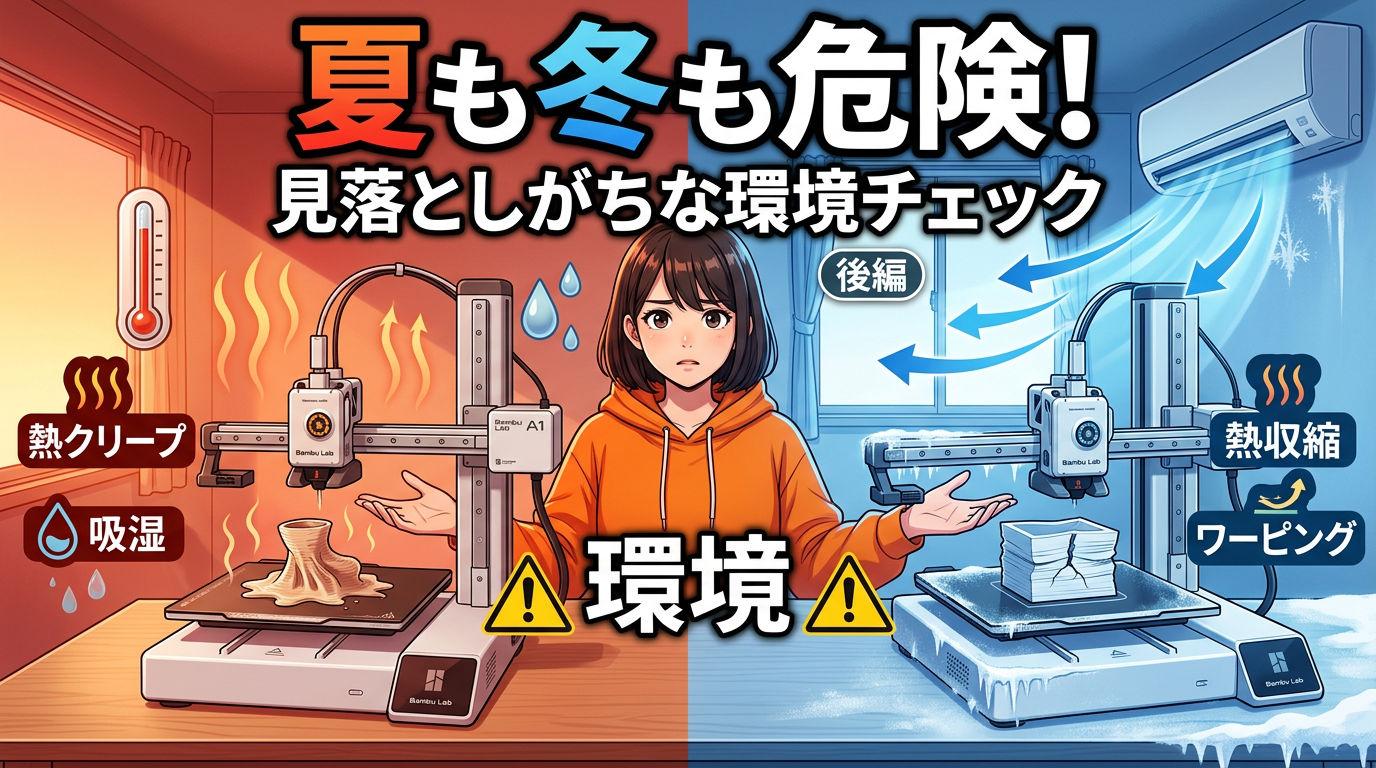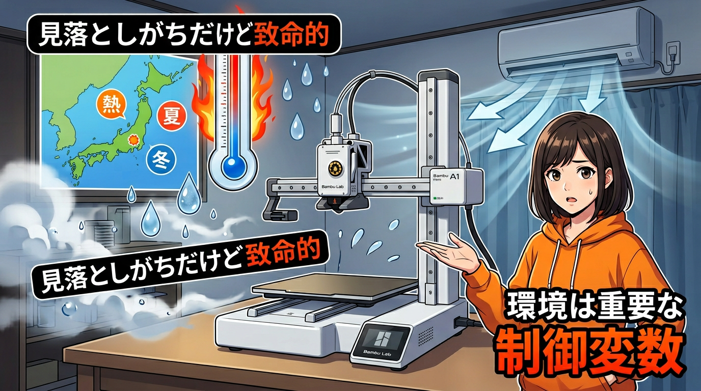 3Dプリンターの外側を取り巻く環境は、造形の成否を分ける重要な制御変数なんです。日本の気候、特に夏と冬の極端な温度差がある地域ではなおさらです。