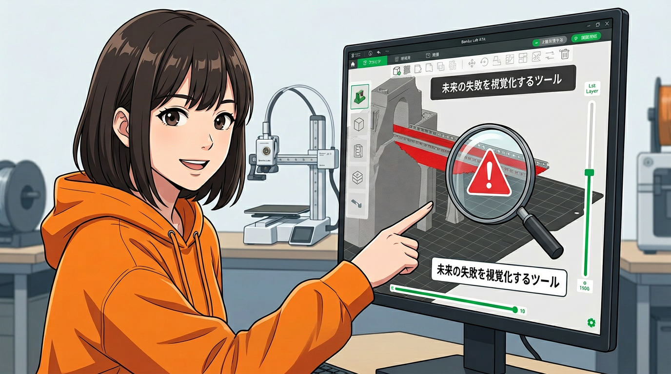 スライサーのレイヤープレビューは「未来の失敗を視覚化するツール」です。スライダーを上下に動かして、空中に完全に浮いている部分がないか目視で確認してください。