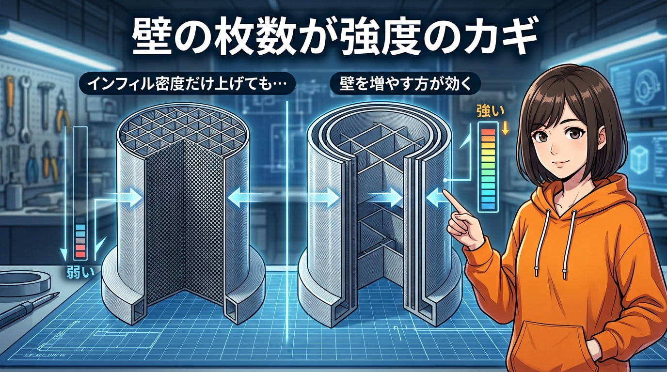 実用部品では、インフィル密度だけを上げるより、壁の枚数を増やしたほうが効くケースが多いです。用途に応じて壁の枚数が適切に設定されているか確認してください。