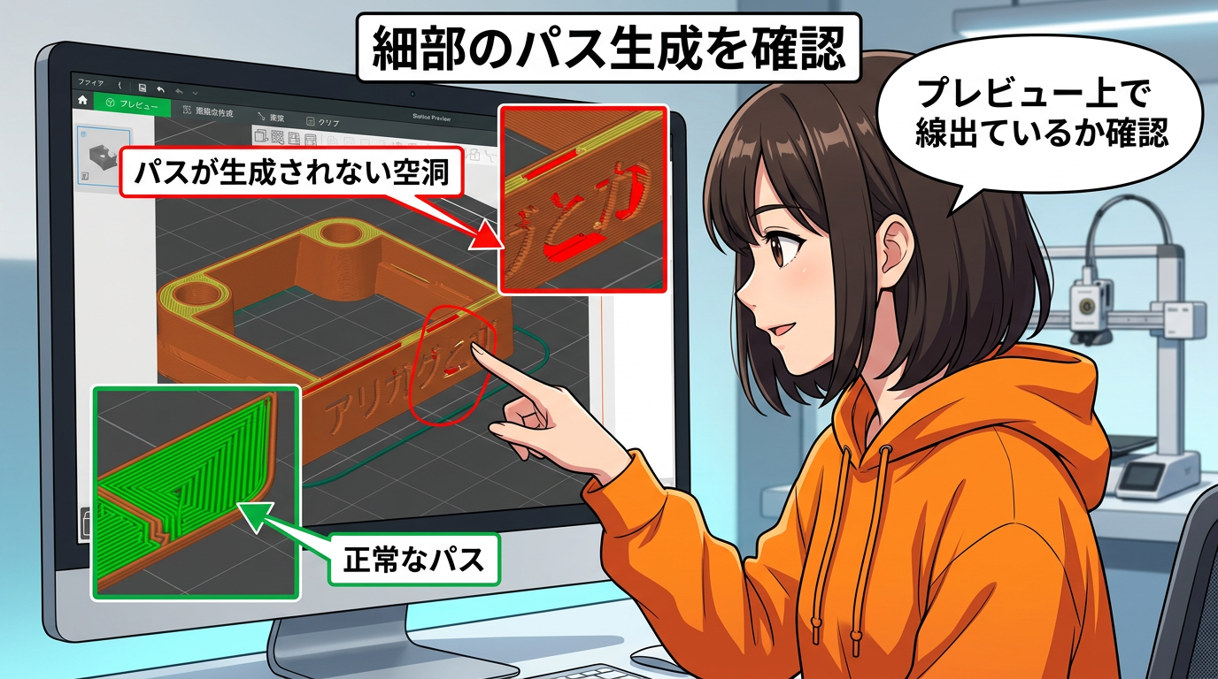 プレビューで、細い壁や文字の部分にちゃんと押し出しパスが出ているか確認してください。壁生成方式や細部の埋め処理の影響で、薄い部分が意図通りに出ないことがあります。日本語UIでは表記が環境やバージョンで少し違うことがあるので、設定名そのものよりも、プレビュー上で線が出ているかを優先して見てください。