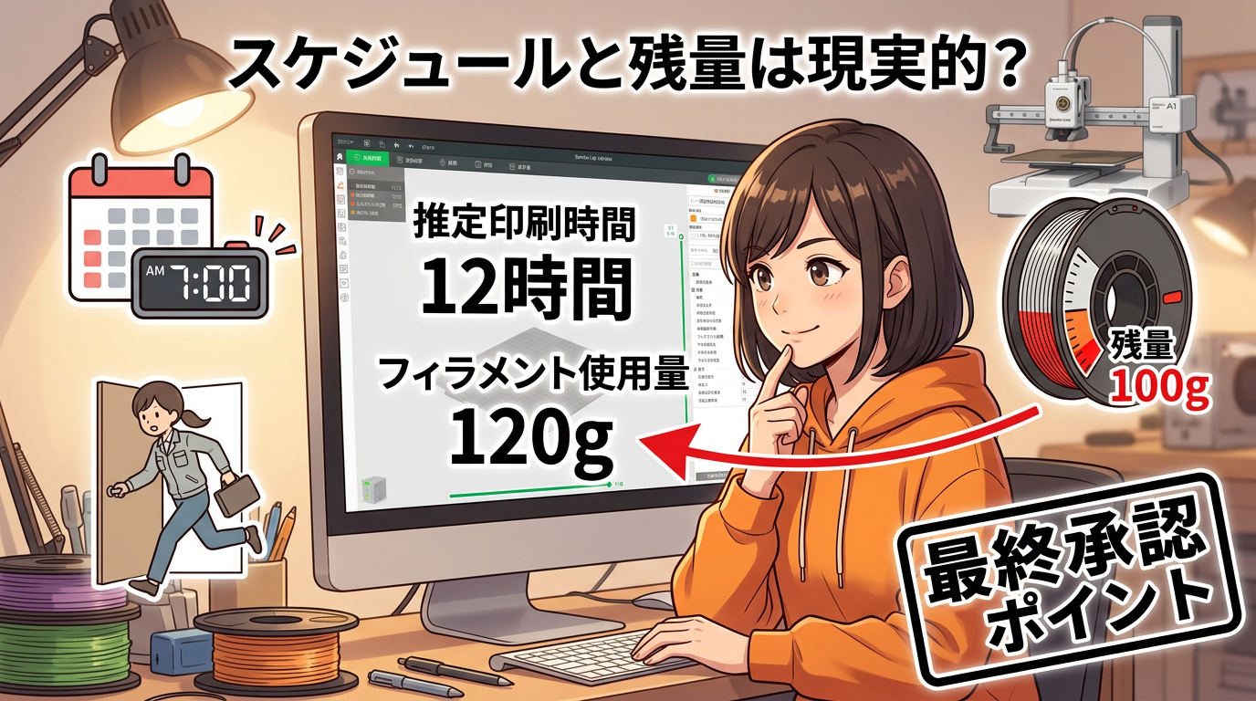 表示された総印刷時間とフィラメント使用量が、自分のスケジュールとスプール残量に対して現実的かどうか。12時間のプリントなのに翌朝出かける予定がある、とか。スプールが残り100gなのに予測消費量が120g、とか。ここが最終承認ポイントです。