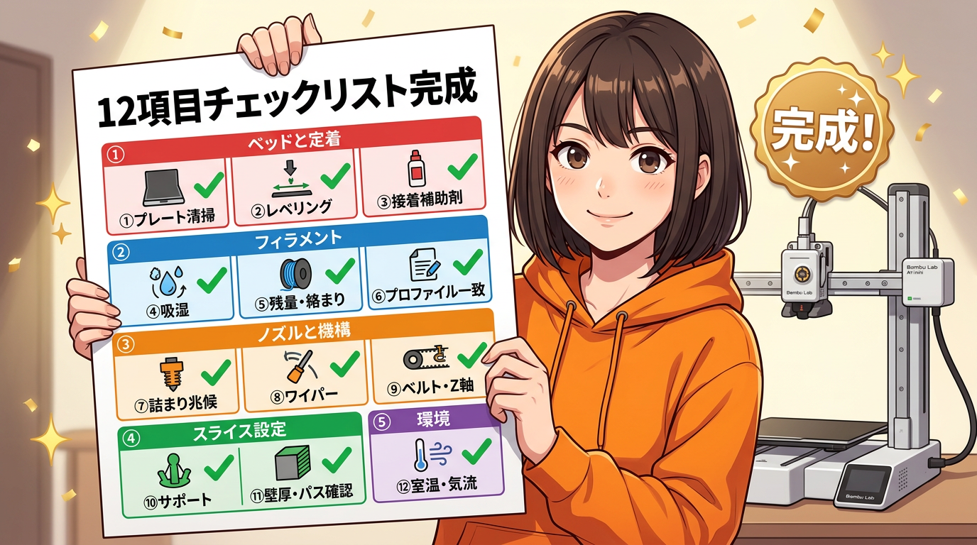 ① ベッドの清掃、② レベリング有効期限、③ 接着補助剤。④ 吸湿チェック、⑤ 残量と絡まり、⑥ 材質とプロファイルの一致。⑦ ノズル詰まりの兆候、⑧ ワイパーとエクストルーダー、⑨ ベルトとZ軸。