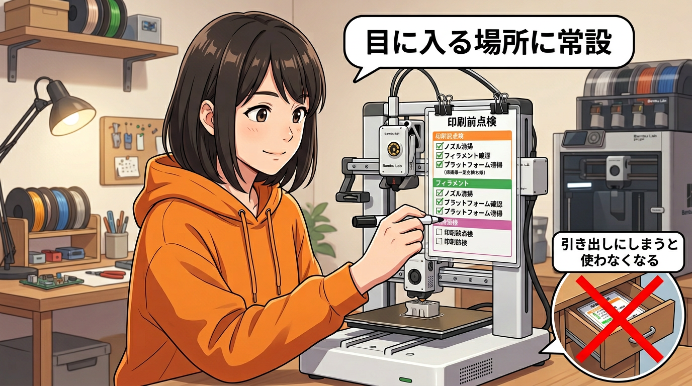「5分の習慣が、5時間の失敗を防ぐ」。これ、大げさじゃなくて実際にそうなりました。数字は機種、材料、造形物の難易度で大きく変わるので、あくまで参考値として見てください。