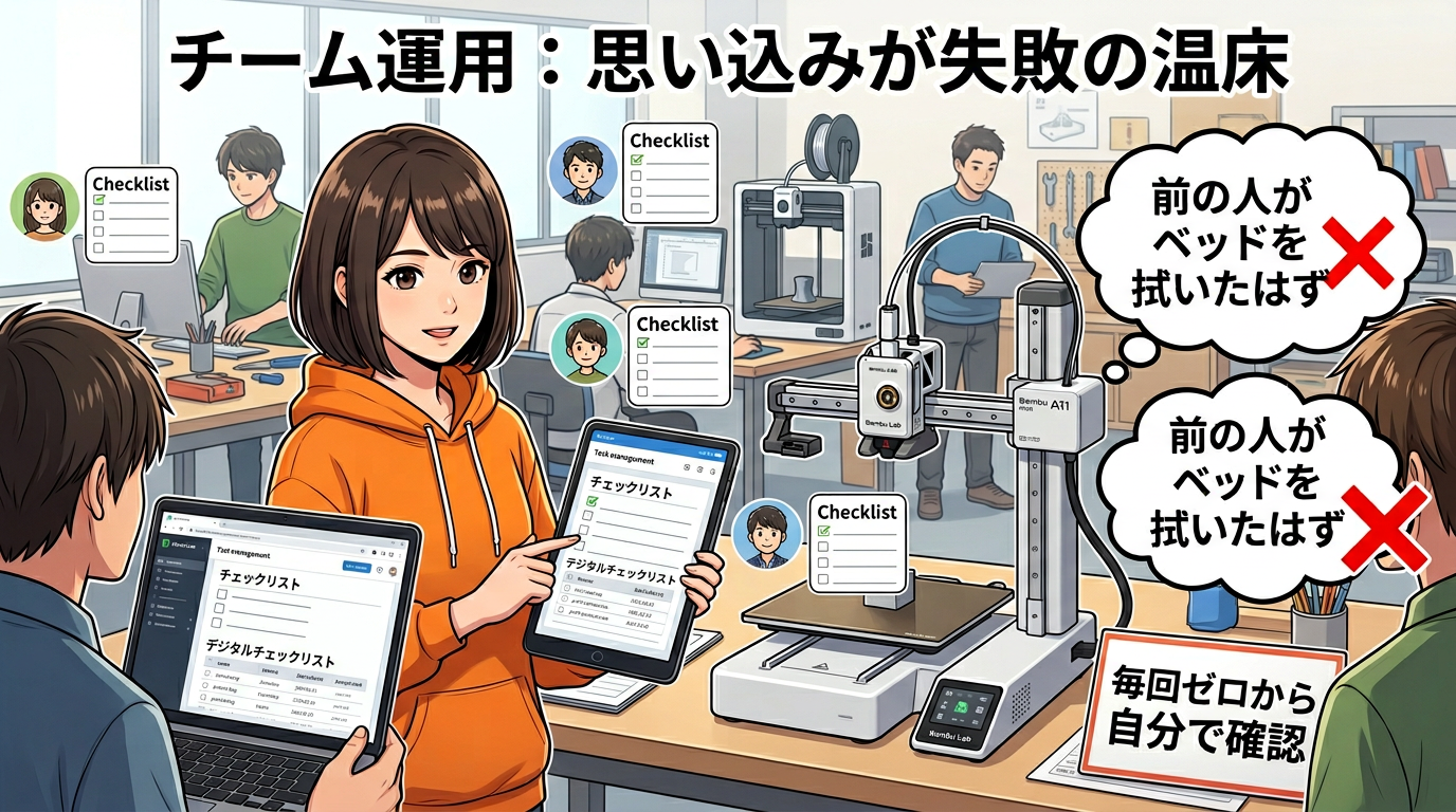 特に学校のメイカースペースや会社のプロトタイピング部門など、複数人で1台のプリンターを共有する場合。「前の人がベッドを拭いたはず」「前の人が設定を戻したはず」っていう思い込みが失敗の温床です。使う人が毎回必ず自分の責任でゼロから確認するルールを徹底してください。