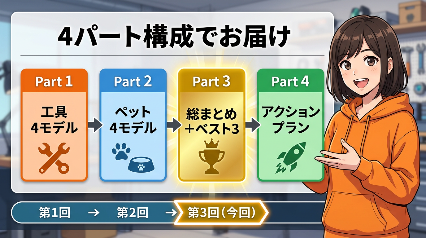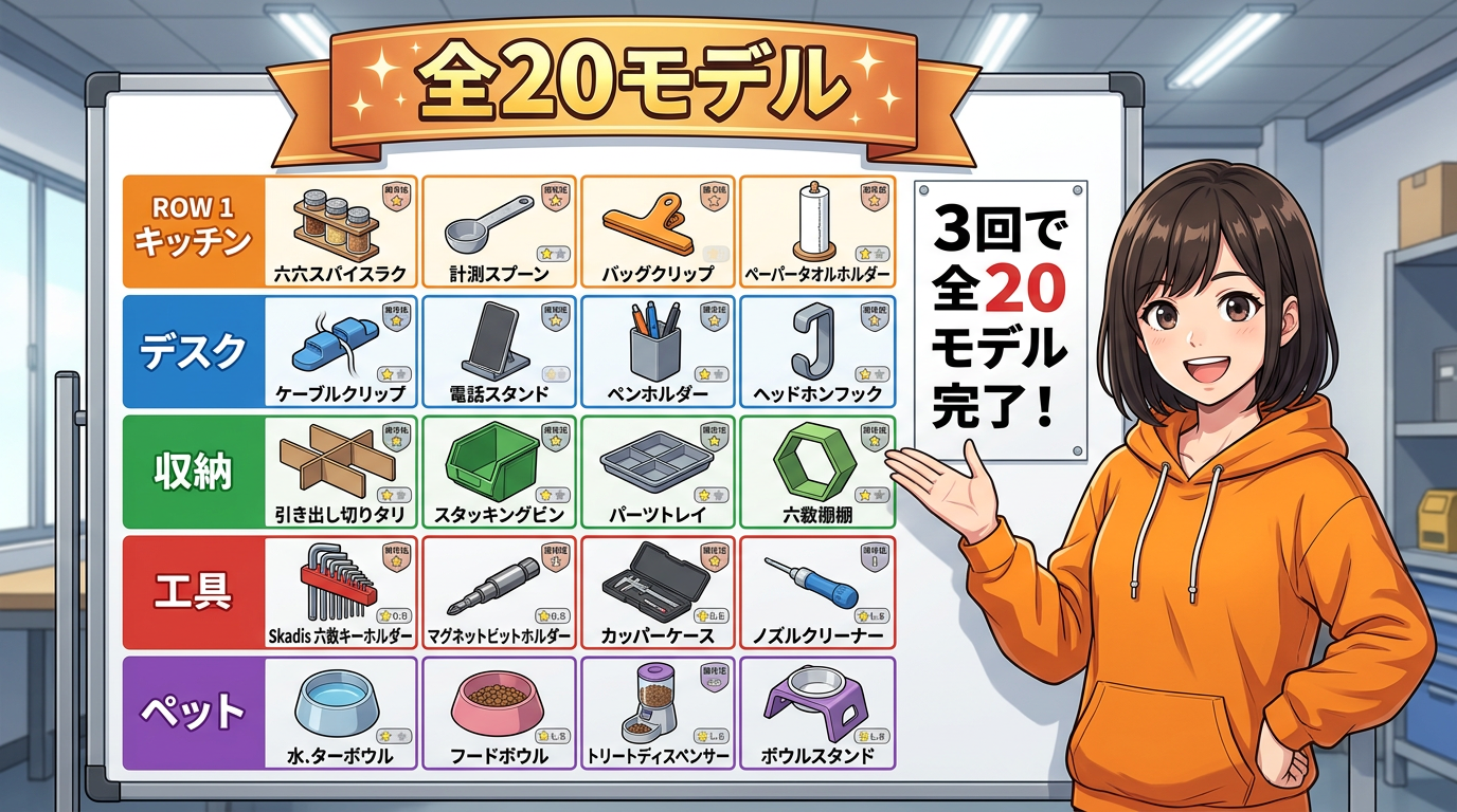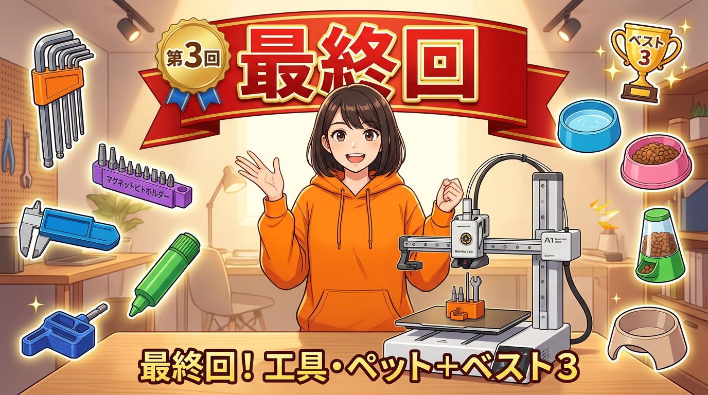 第1回ではThingiverseとMakerWorldの使い方やモデルの選び方を、第2回ではキッチン・デスク・収納の12モデルを紹介しました。今回は残りの工具4つとペット4つの計8モデルを紹介して、最後に20モデルの中から僕のベスト3を発表します。