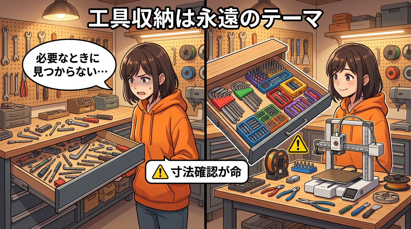 3Dプリンターを使う人って、だいたい工具も使うんですよね。で、工具の収納って永遠のテーマじゃないですか。引き出しの中でゴチャゴチャ、必要なときに限って見つからない。