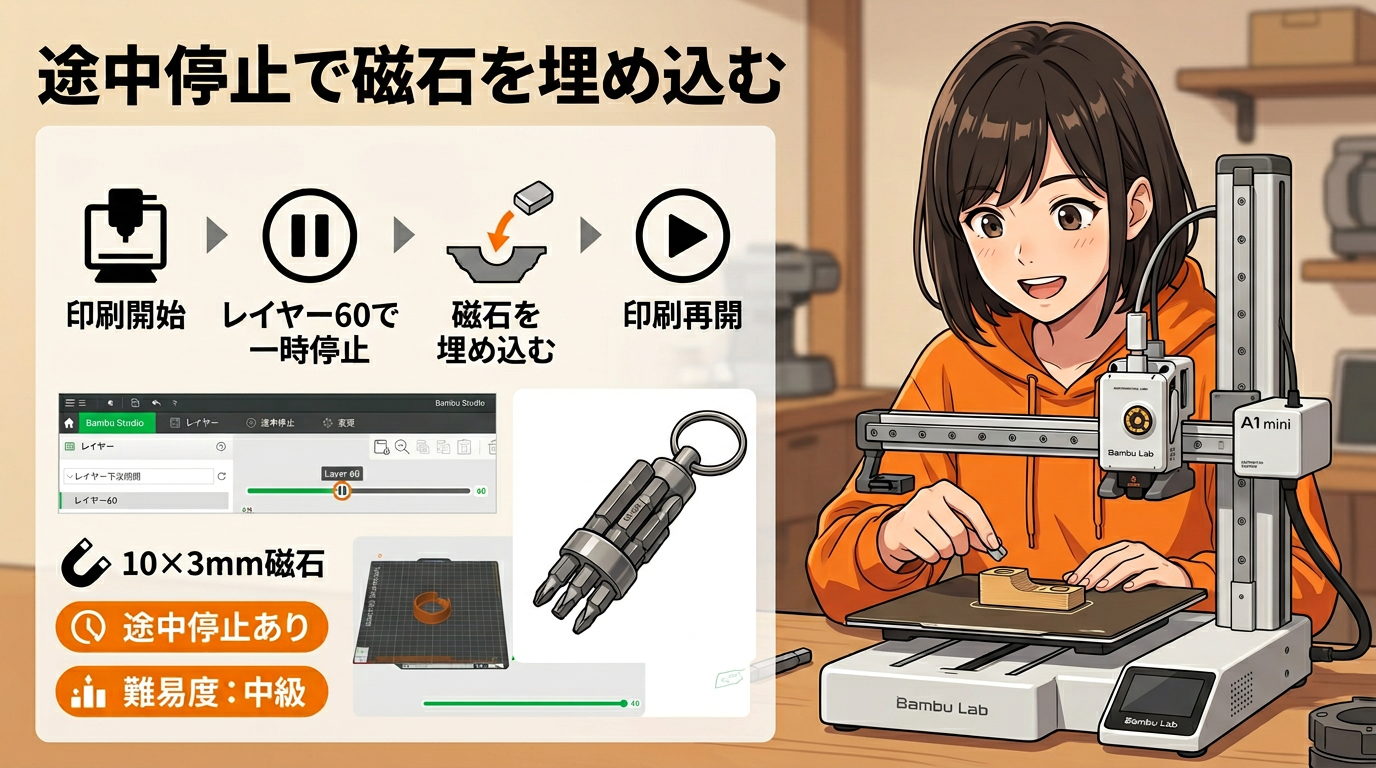 Bambu Studioでは、スライス後のレイヤーバーで該当位置を右クリックして「一時停止を追加」し、印刷を止めて磁石を入れてから再開します。