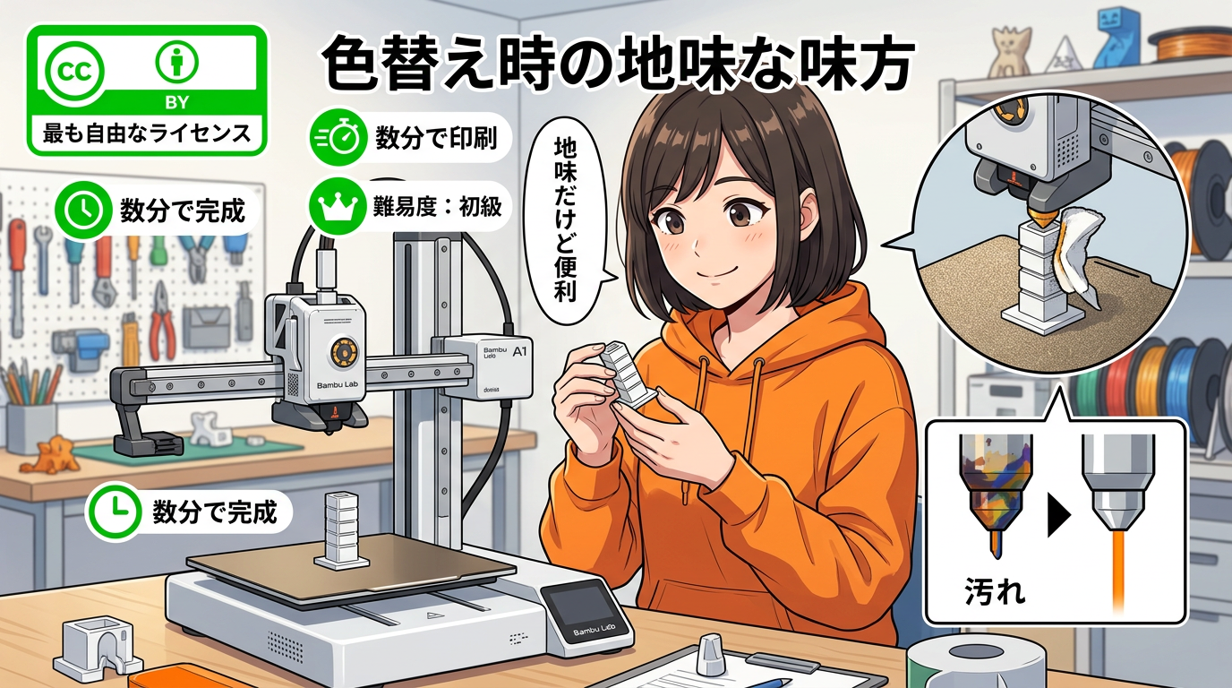 難易度は初級。ライセンスはCC BYで、一番自由なライセンスです。色替えのたびにパージタワーを建てるより、こういう小物で吐き出させるほうが効率的な場面もありますよね。メンテナンス系の地味だけど実用的なモデルです。