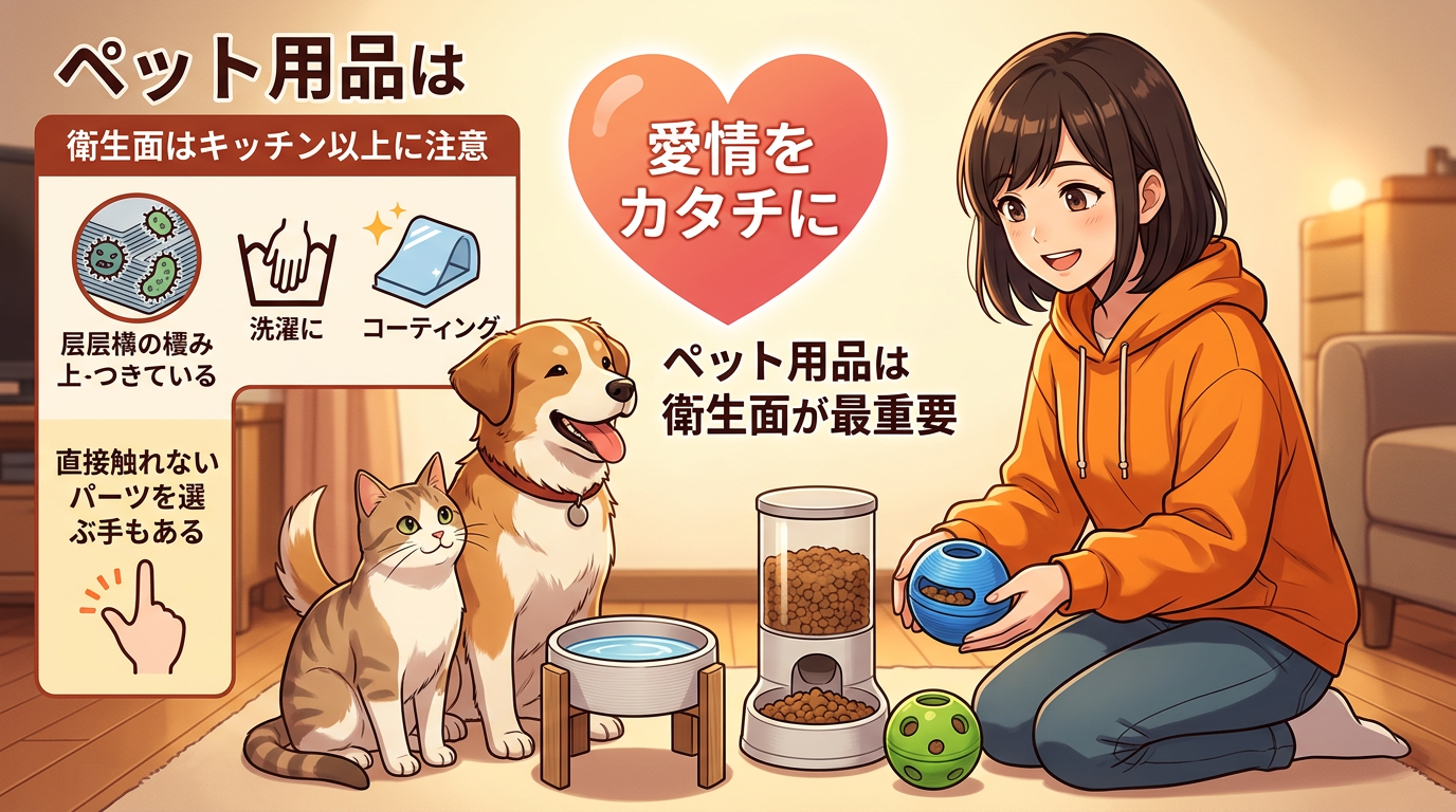 ただし衛生面の注意は、キッチンと同じかそれ以上に重要です。水やフードに直接触れるものは、積層表面の溝に菌が溜まる可能性がある。定期的な洗浄はもちろん、必要ならコーティングも検討してください。あるいは「直接触れない」パーツ、スタンドとかホルダーを選ぶ方法もあります。