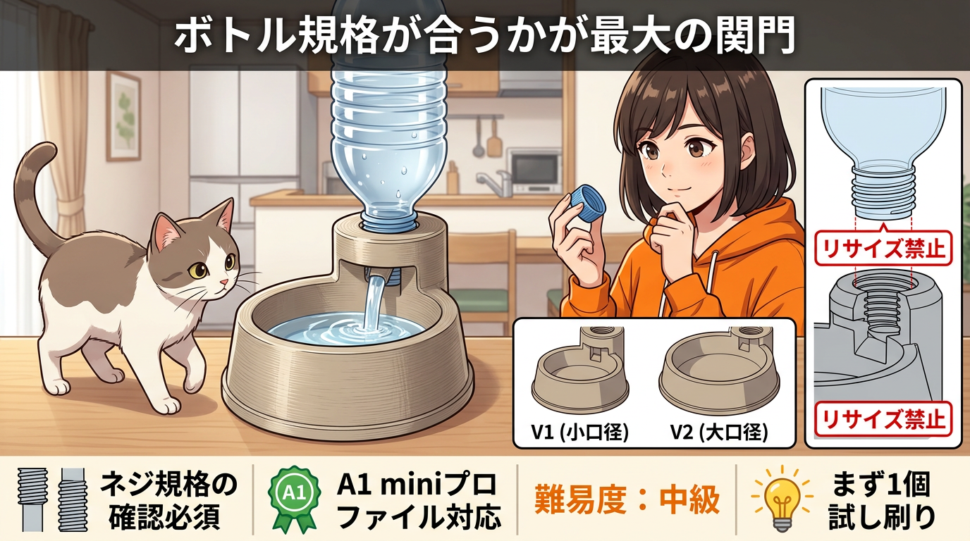 A1 mini向けプロファイルも表示されてます。難易度は中級。手持ちのボトル規格が合うかどうかが最大の関門です。モデルによっては1L前提や5L前提のものがあるので、まず1個試しに刷ってみて確認するのがおすすめ。