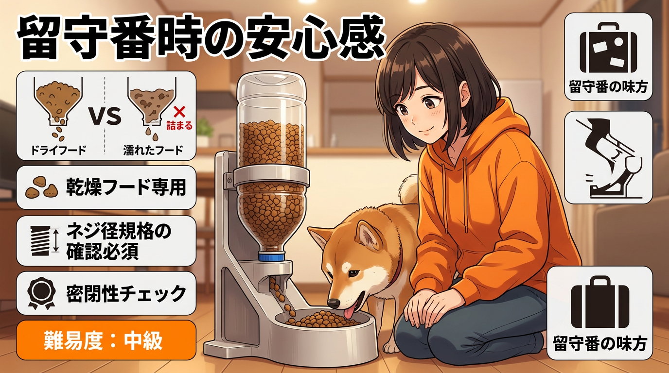 難易度は中級。密閉性、清掃のしやすさ、フードの粒サイズとの相性を確認する必要があります。留守番させるときの安心感がありますよね。ただ、最初は横で見てて、ちゃんとフードが出てくるか確認してから使ってください。