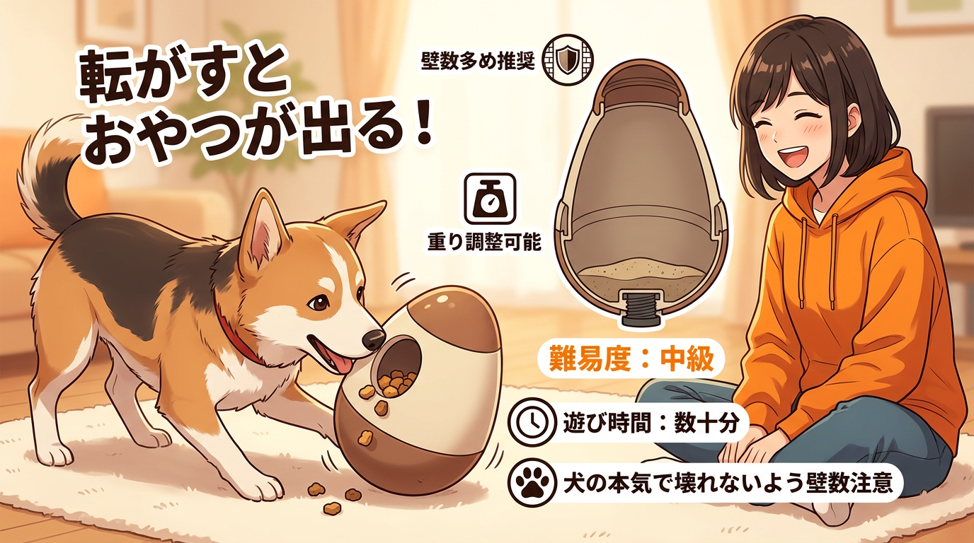 難易度は中級。重りの調整、おやつサイズとの相性、誤飲防止への配慮、それから耐久性。犬が本気で遊ぶと結構な力がかかるので、壁数を多めにしておくと安心です。犬が夢中で転がしてるの見ると、作った甲斐があるなって思いますよ。