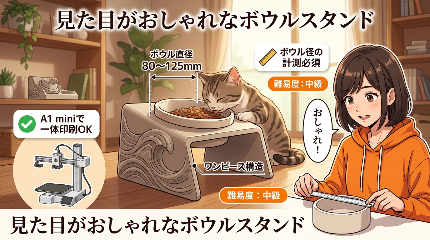 難易度は中級。事前にボウルの直径を計測するのが必須です。見た目がおしゃれで、ペットの食事風景がちょっと良くなる系のモデルです。