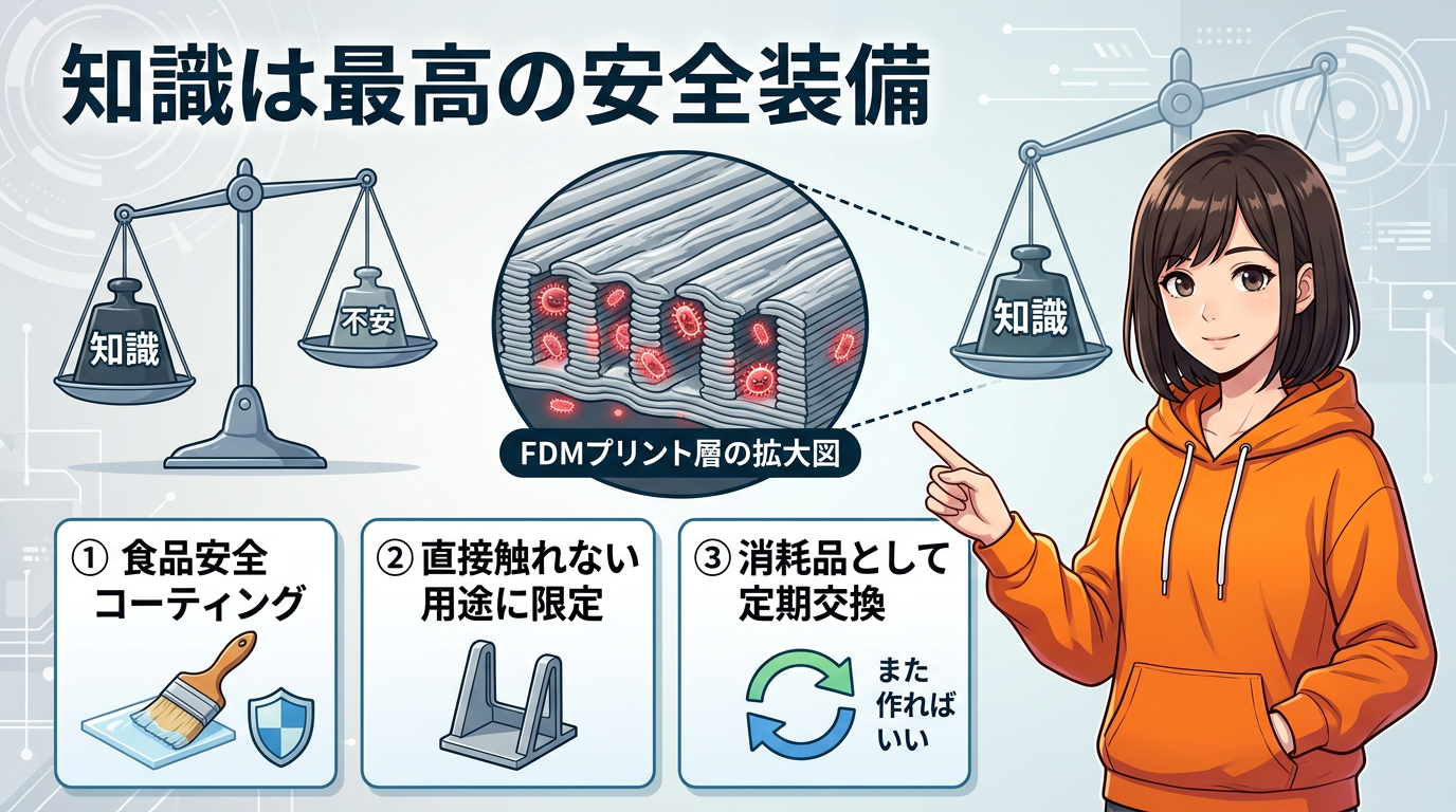 FDMの積層表面には顕微鏡レベルの凹凸がある。洗っても溝に菌が残りうる。これはメーカーや材料側からも指摘されてることです。