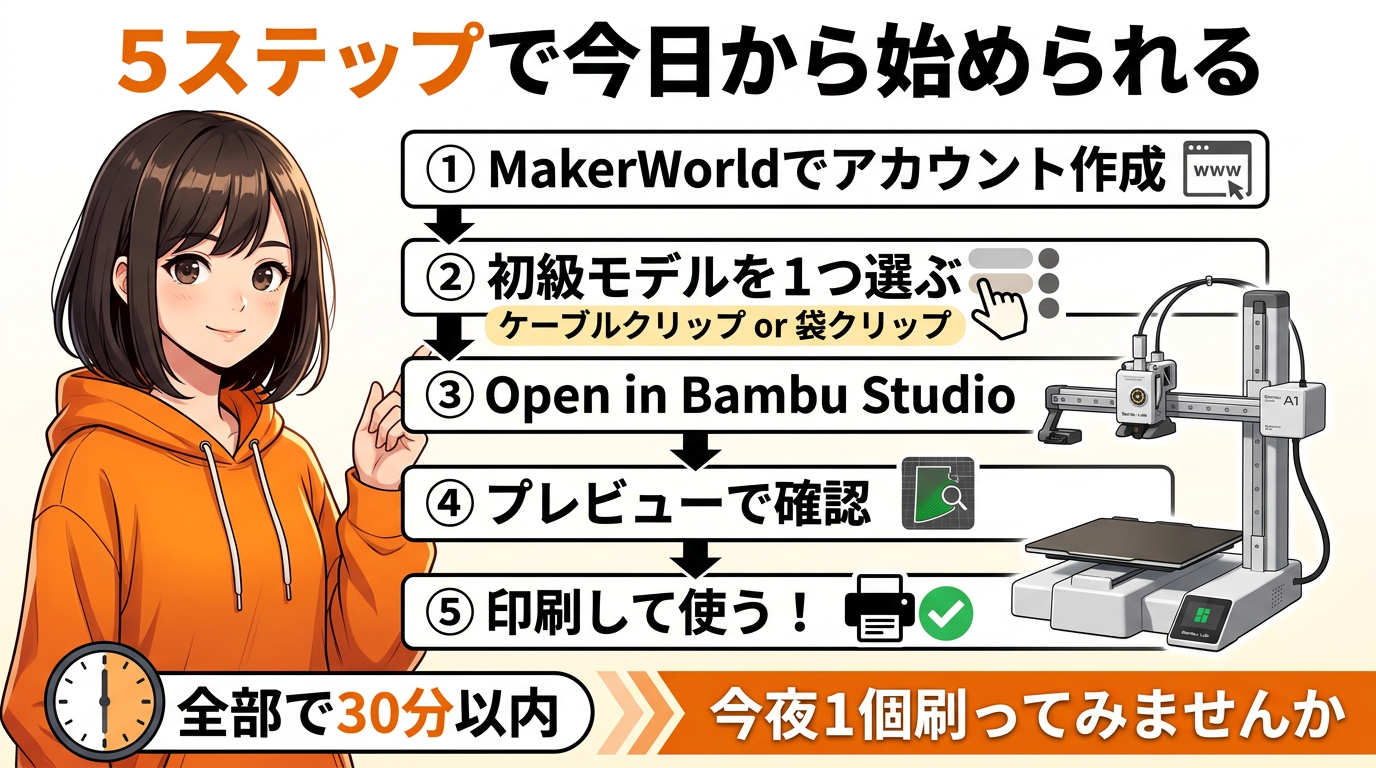 ThingiverseもMakerWorldも無料で使える。モデルページの読み方も、難易度の見分け方も、もう知ってる。あとは実際に1つ、印刷するだけです。