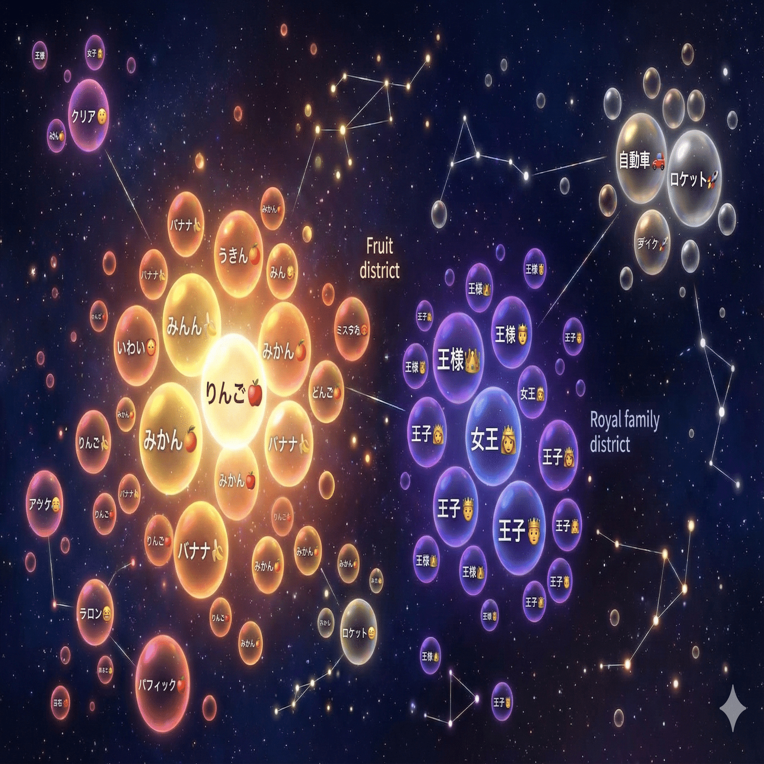 一方、「自動車」や「ロケット」は、「りんご」からずっと遠く離れた場所に配置されます🚗🚀