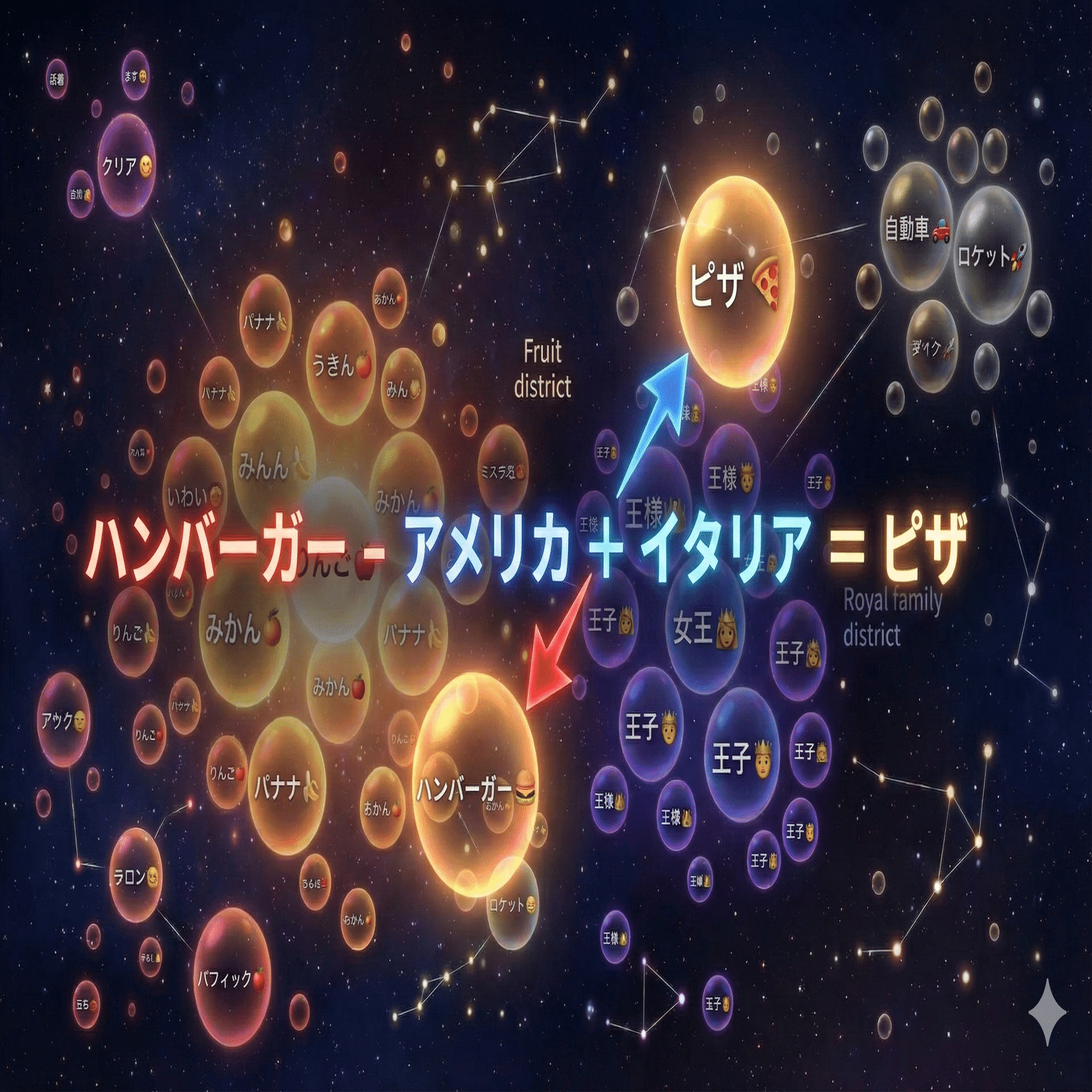言葉の計算: 地図上の移動(ベクトル計算)によって、「ハンバーガーからアメリカを引いてイタリアを足す」といった推論ができる!🍔📐