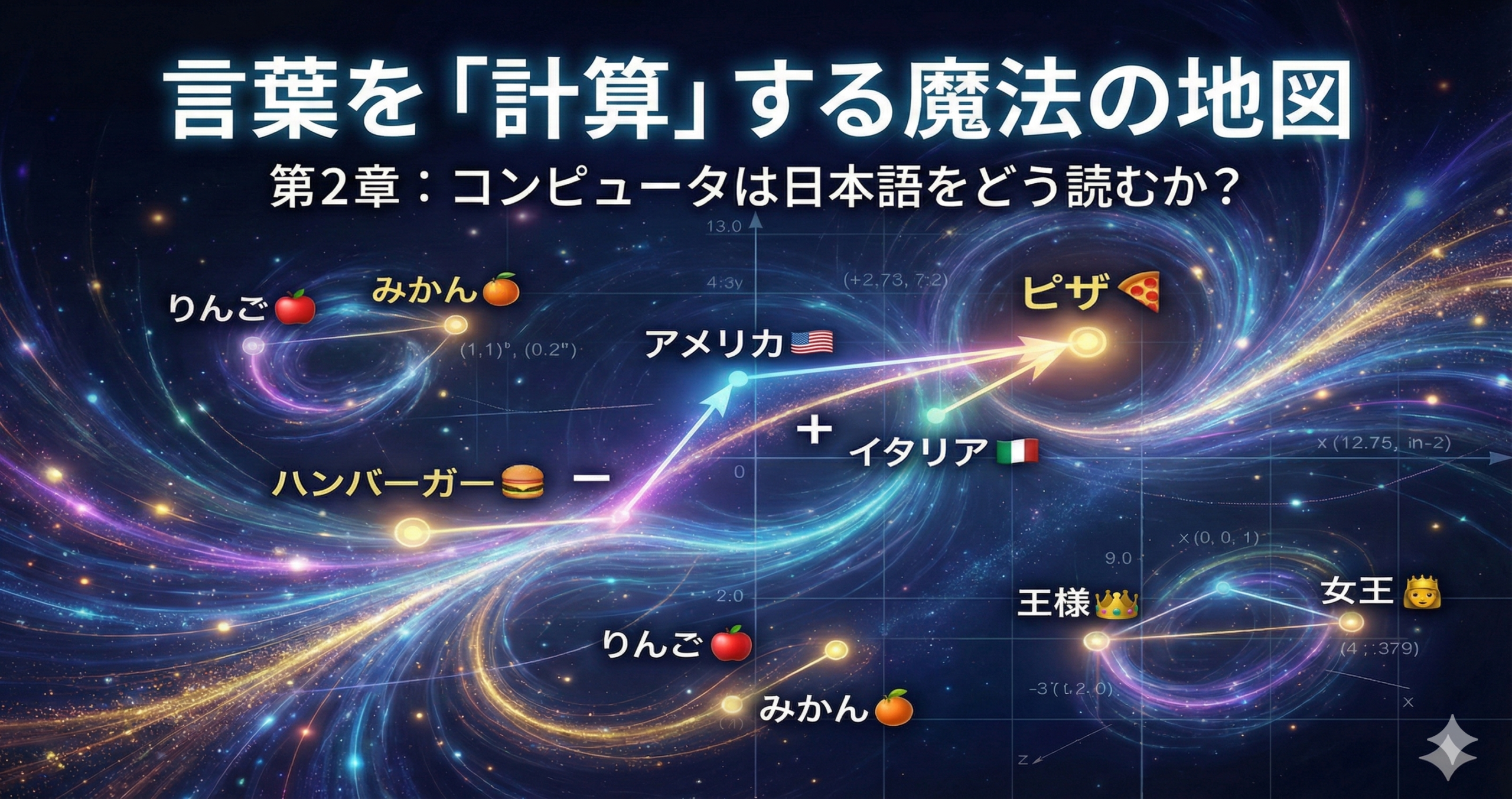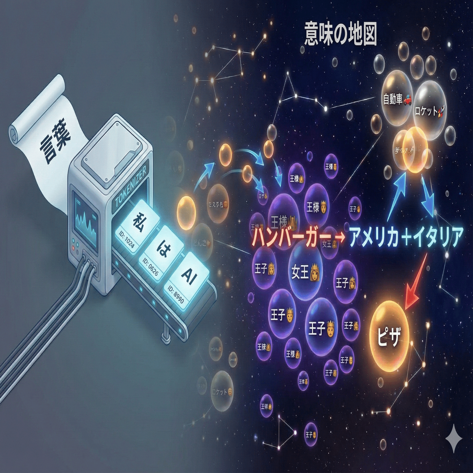 実はAIは、私たちの言葉を「数字」に変換し、さらに「地図上の座標」に置き換えるという、ものすごい翻訳作業を行っているんです!🔄