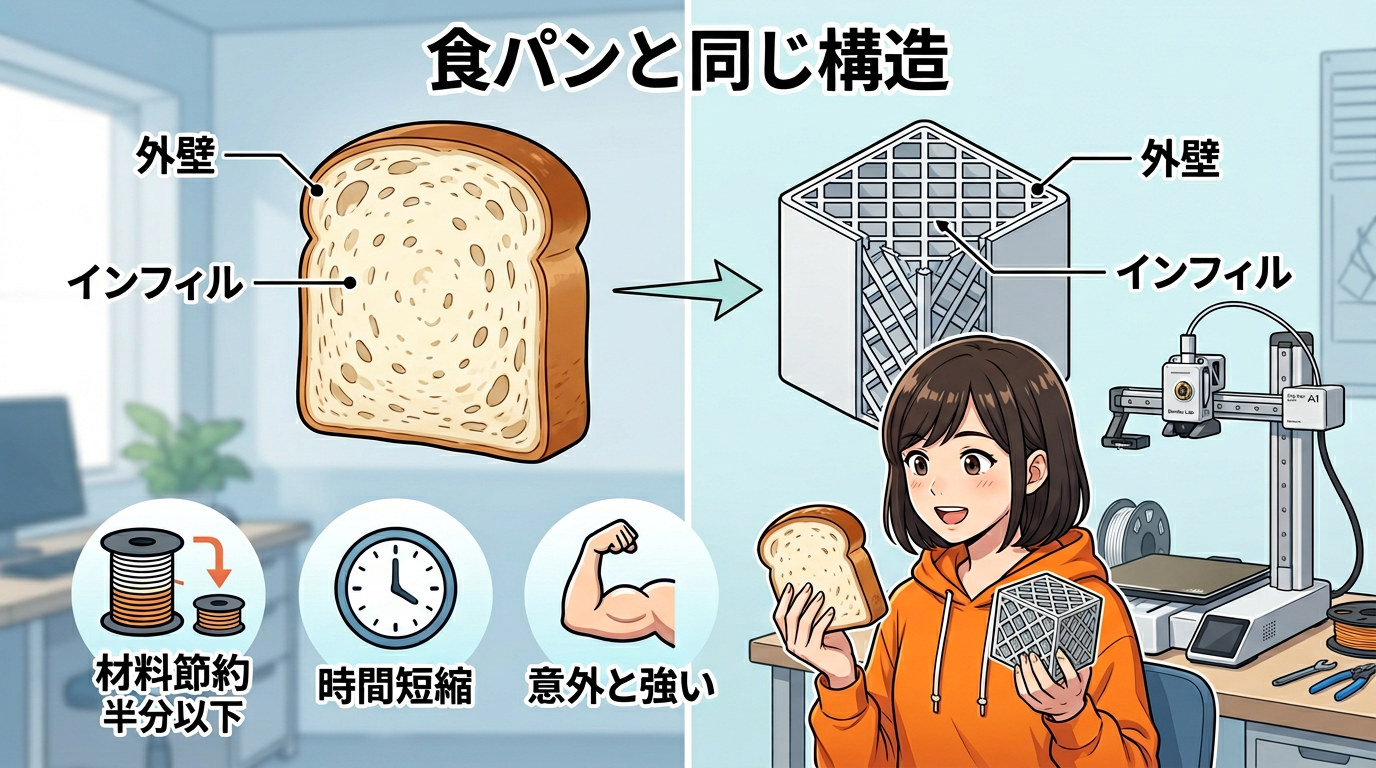 3Dプリンターで作ったパーツって、中身がぎっしり詰まってるわけじゃないんです。食パンを想像してください。外側はパンの耳でしっかりしてるけど、中は柔らかい部分がたくさんあるじゃないですか。