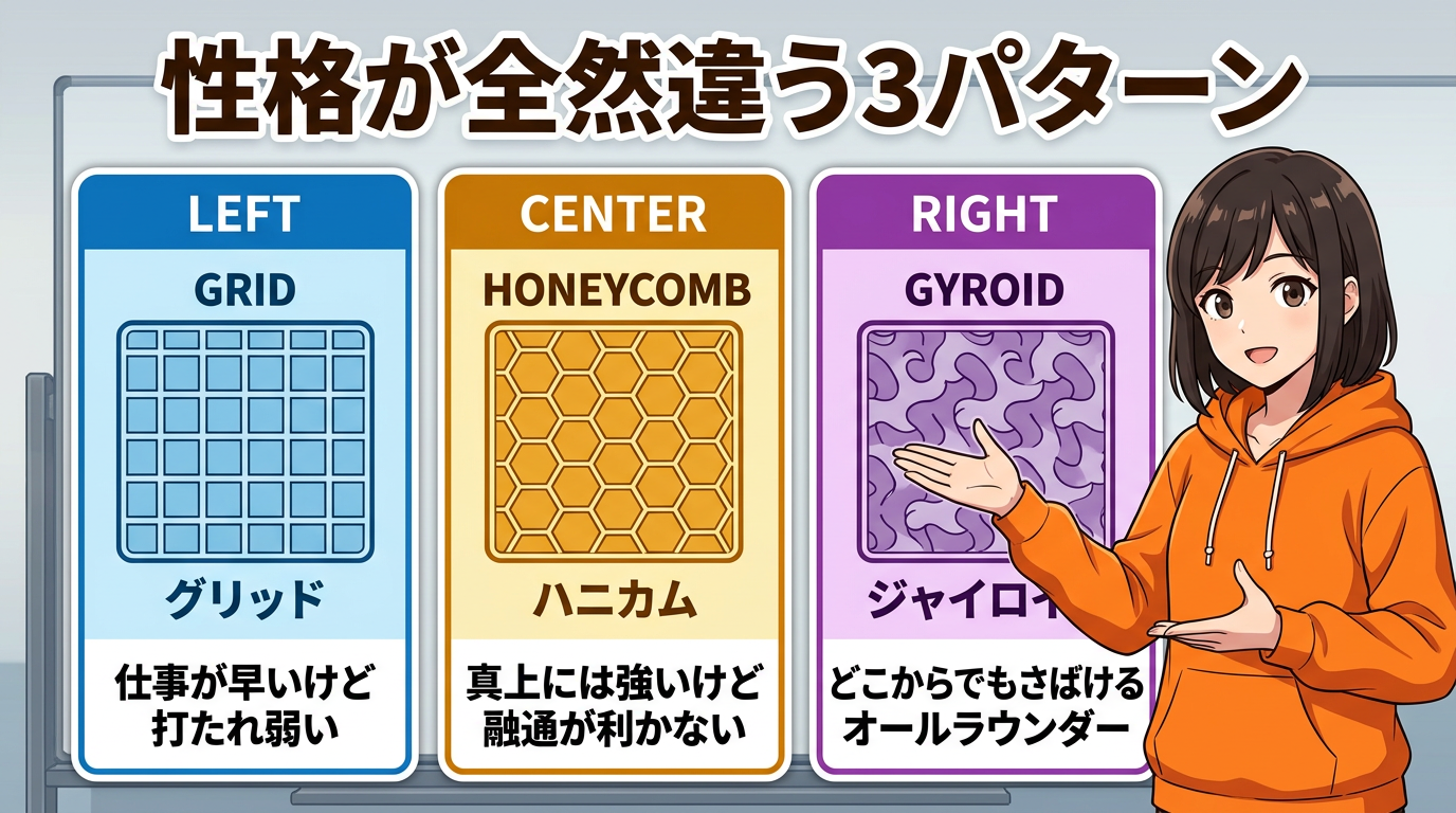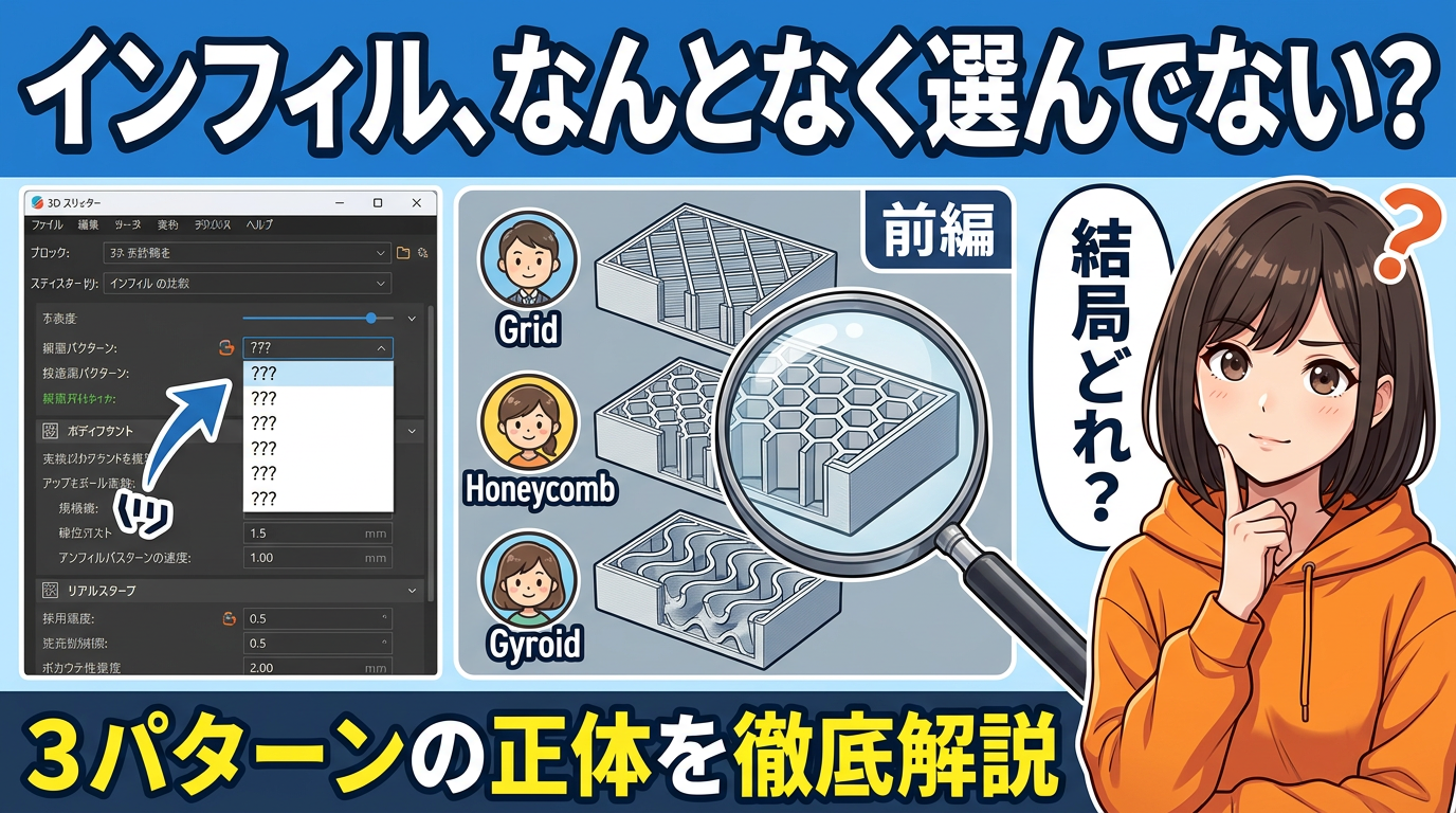 今回から2回にわたって、3Dプリンターの「インフィルパターン」を本気で比較していきます。ジャイロイド、グリッド、ハニカム。スライサーの設定画面でこの3つを見たことがある人は多いと思うんですけど、「結局どれを使えばいいの?」ってちゃんと答えられる人って実は少ないんですよね。