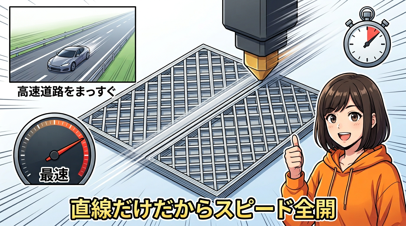 このパターンの最大の強みは、とにかく印刷が速いこと。ノズルが直線を走るだけなので、加速も減速もほとんどいらない。カーブがないからスピード全開で走れるんですよね。
