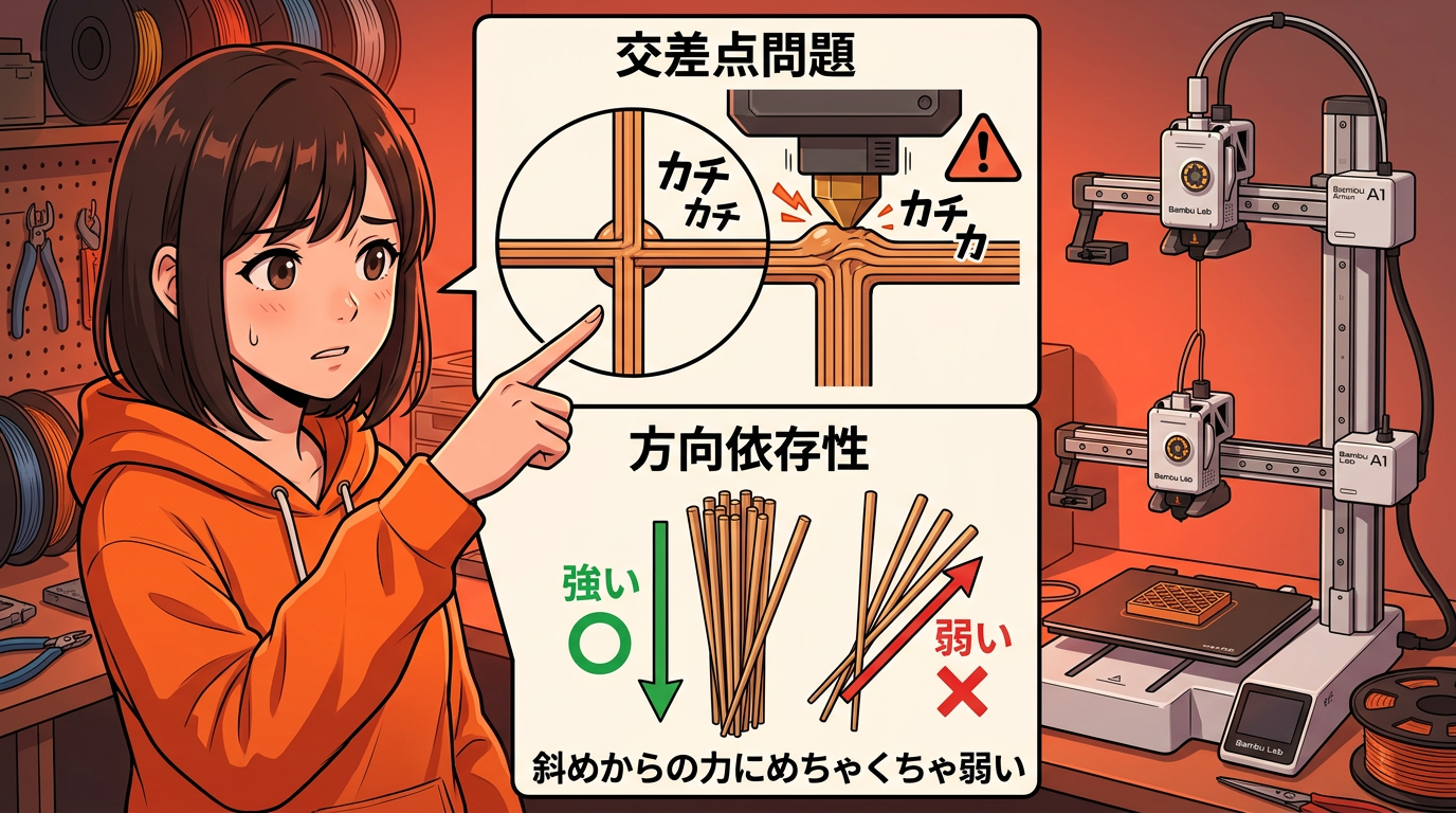 ひとつ目は「交差点問題」。縦の線と横の線が交わるところで、樹脂が重なってちょっと盛り上がるんです。次の層を印刷するとき、ノズルがこの盛り上がりにぶつかる。「カチカチ」って音がしたり、最悪の場合はプリントが失敗することもある。