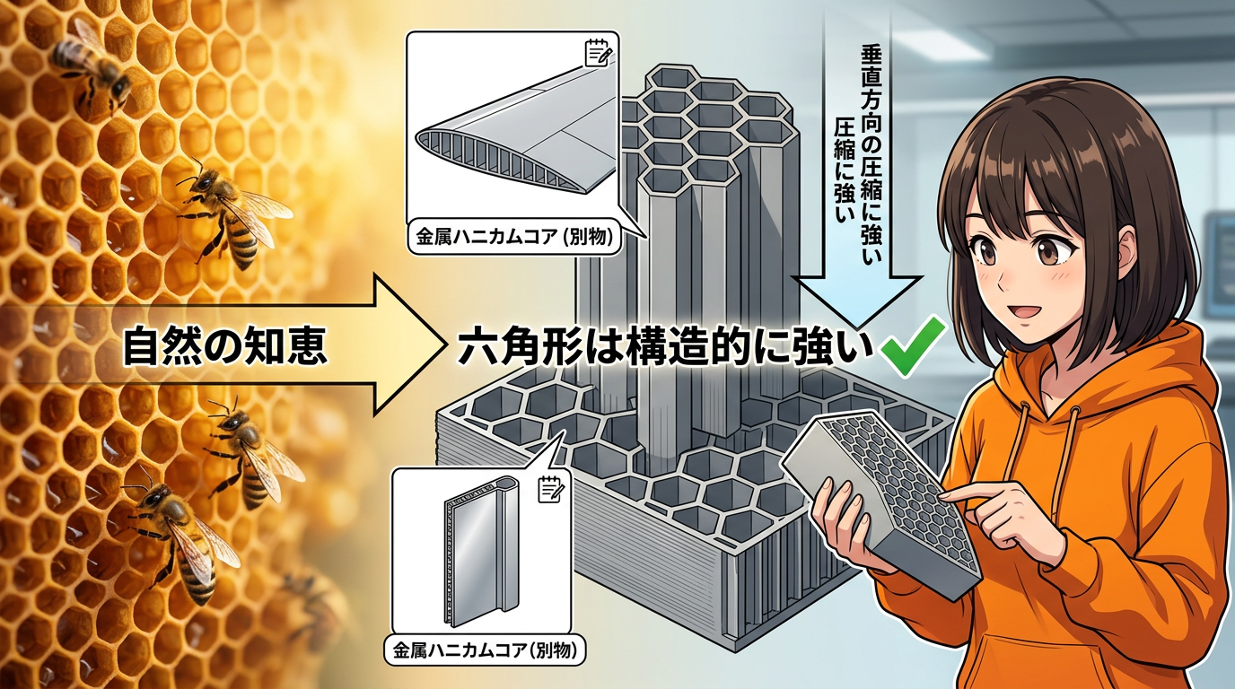 自然界ではものすごく効率的な形で、少ない材料で最大の強度を出せる。航空機の翼やロケットの壁にも使われてるんですけど、これは金属やカーボンの「ハニカムコア」っていう別物なので、3Dプリンターのインフィルとはちょっと違います。ただ「六角形が構造的に強い」っていう原理は同じなんですよね。