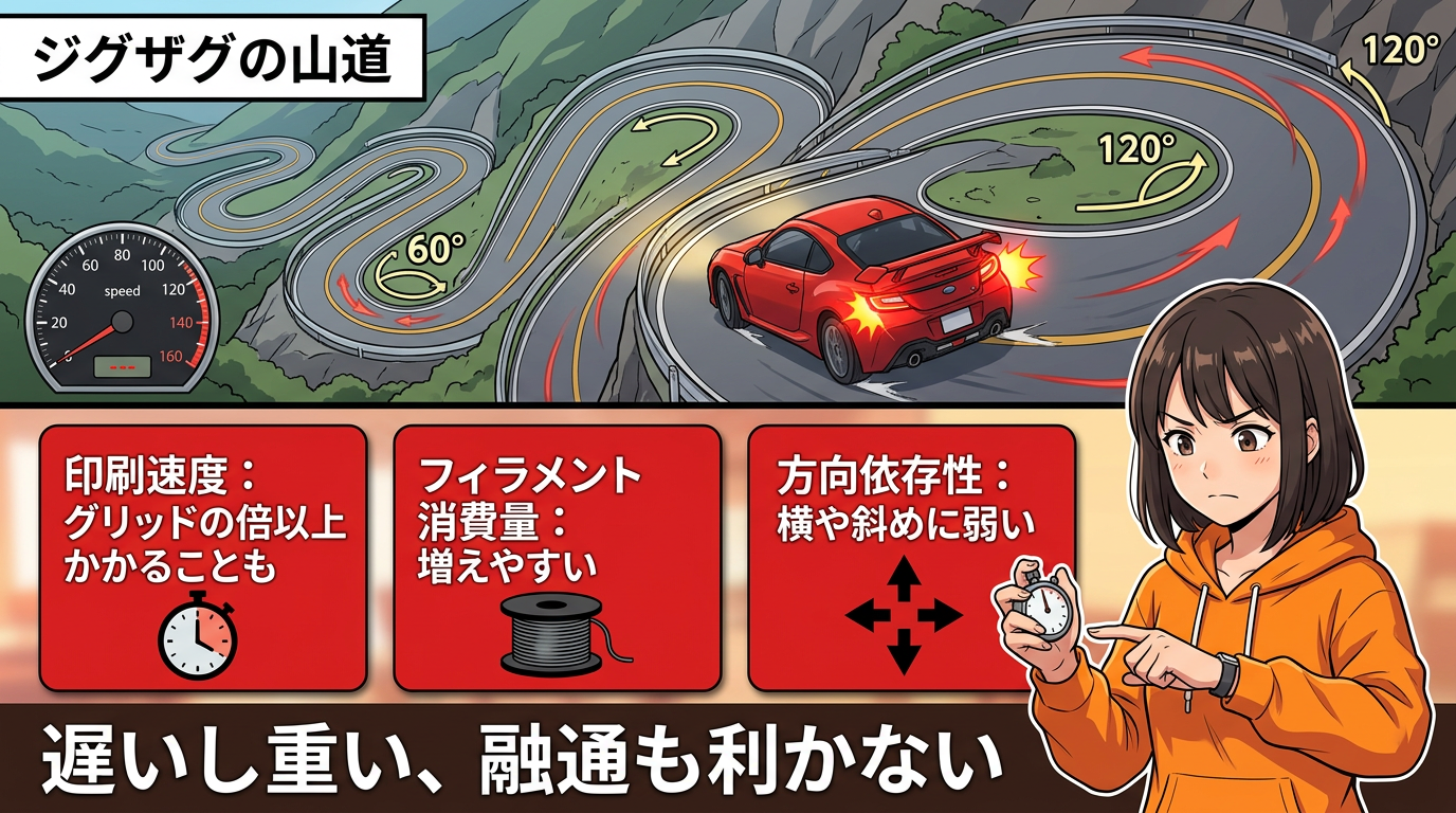 まず、印刷がめちゃくちゃ遅い。六角形を描くために、ノズルが60度とか120度の角度でひたすら方向転換を繰り返す。車で言うと、ジグザグの山道をずっと走ってるようなもの。アクセル踏んだと思ったらすぐブレーキ、また踏んだらまたブレーキ。全然スピードが出ないんです。