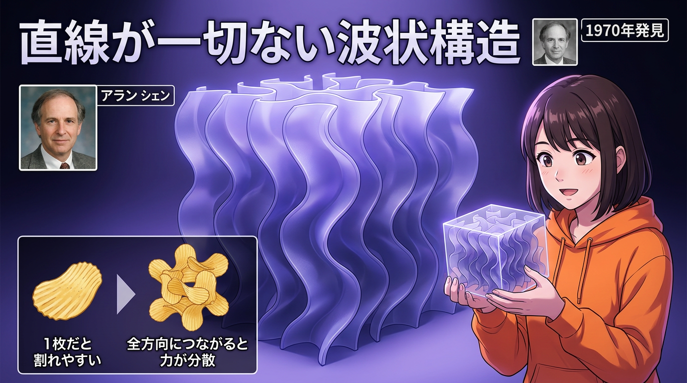 ポテチ1枚だと割れやすいけど、あのうねうねが全方向につながっていたら、どこから押しても力が分散される。これがジャイロイドの基本的な考え方です。