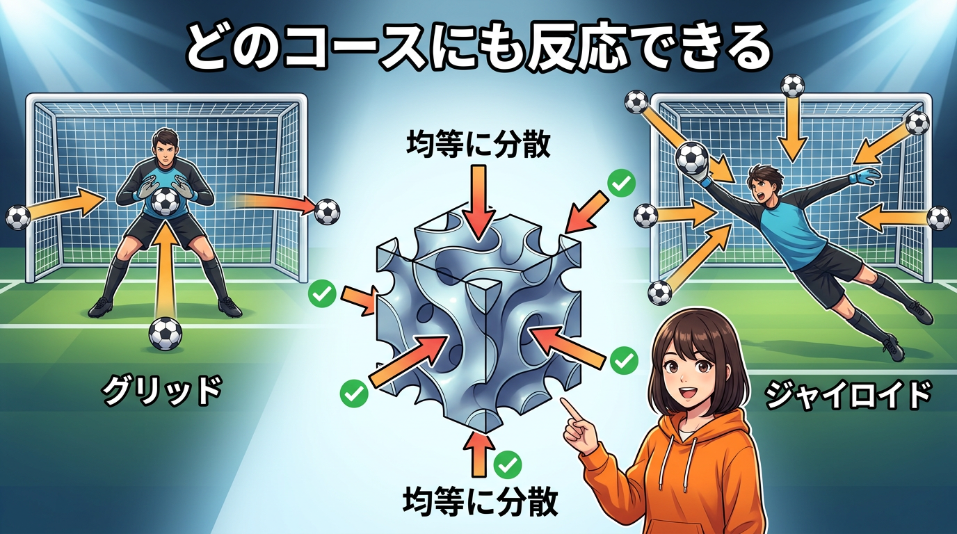 サッカーでいうと、グリッドは「正面のシュートしか止められないキーパー」で、ジャイロイドは「どのコースに来ても反応できるキーパー」みたいなものです。