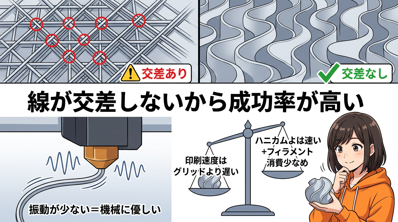 さっきグリッドの「交差点問題」を話しましたよね。ジャイロイドは、同じ層の中で印刷の線が一切交差しないんです。だからノズルがぶつかることがなくて、プリントの成功率が高い。