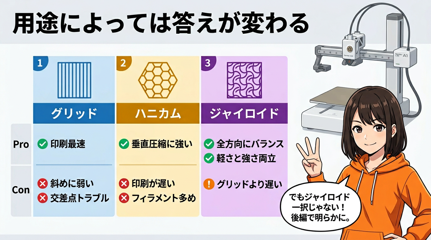 ジャイロイド。長所はどの方向からの力にもバランスよく強くて、軽さと強さを両立しやすいこと。短所はグリッドよりは印刷が遅いこと。